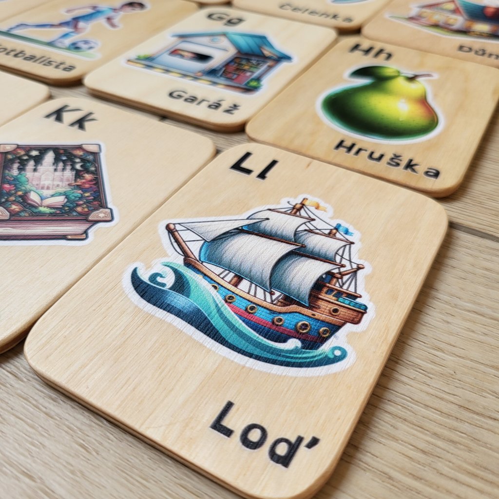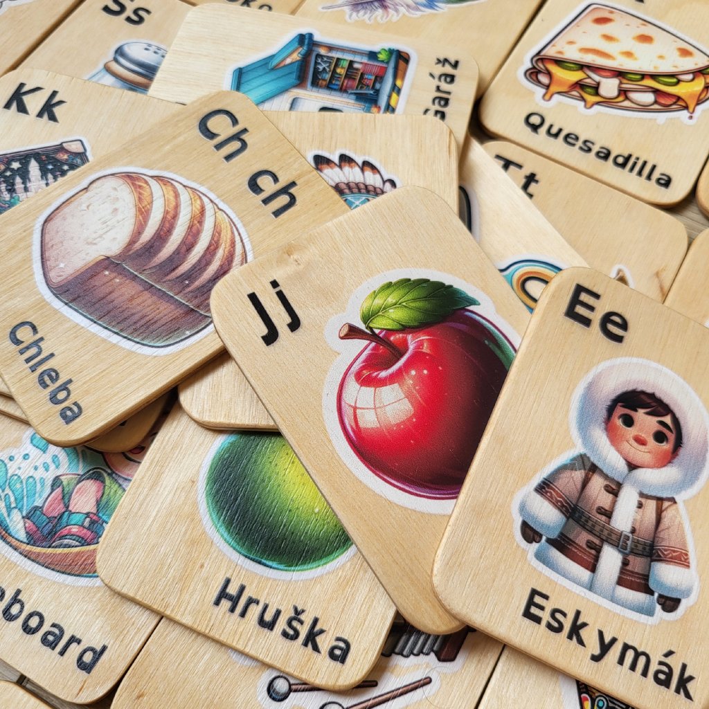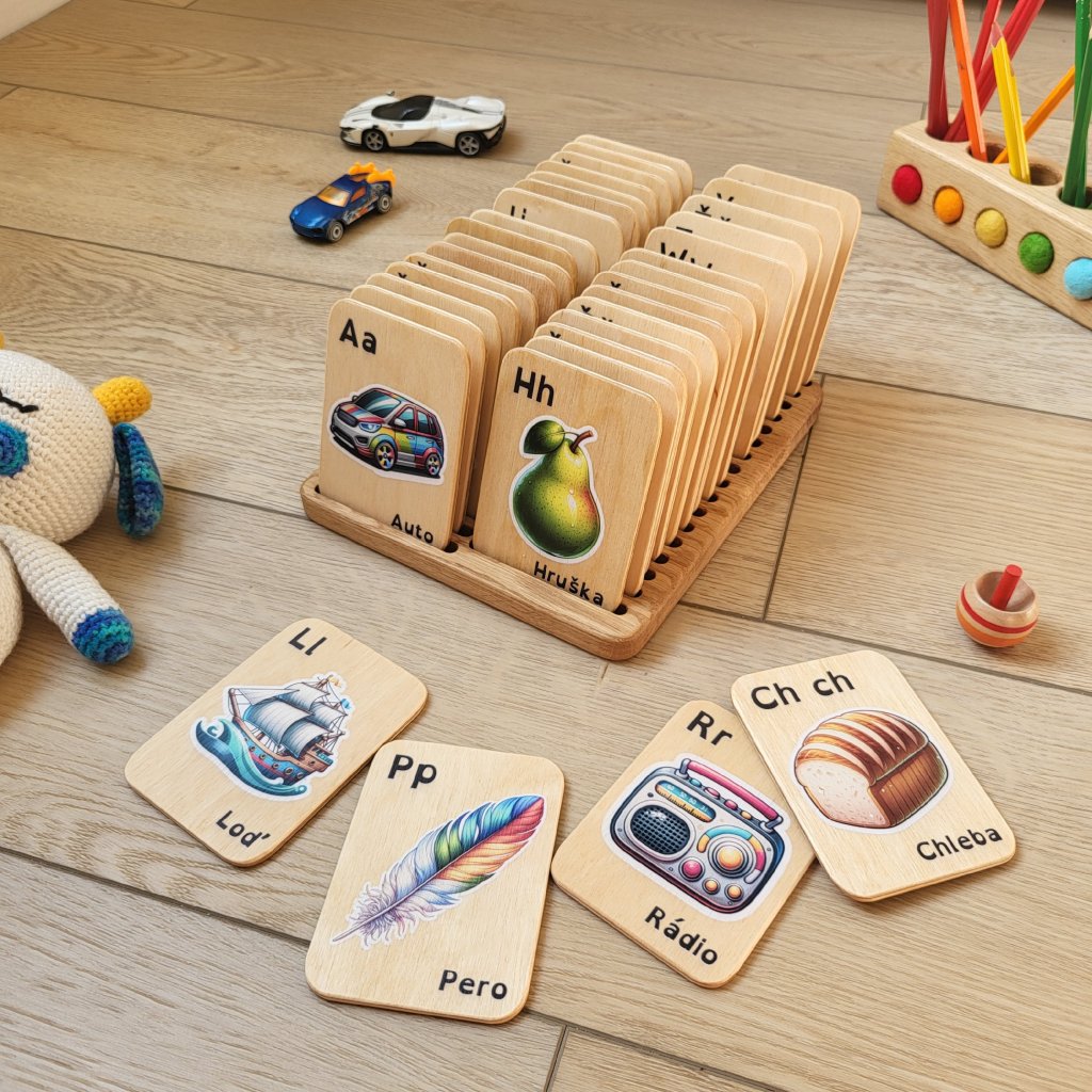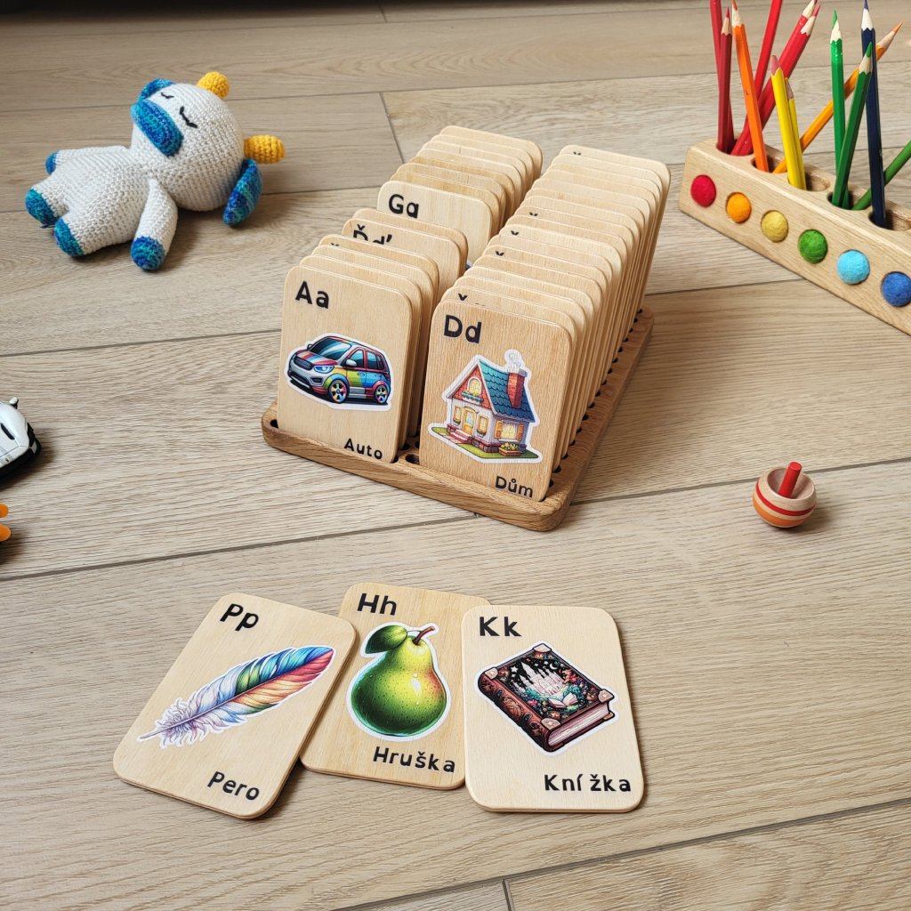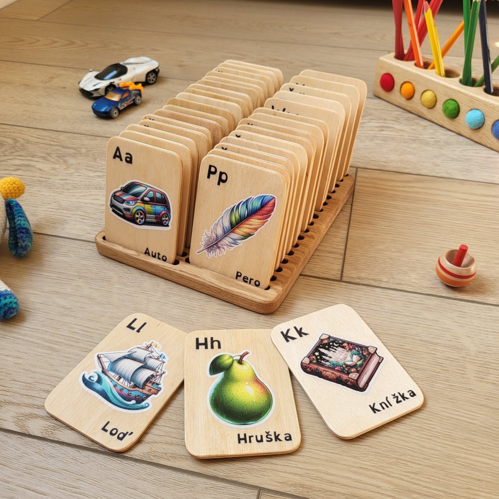 Dřevěná edukativní hra pro děti - Kartičky s obrázky předmětů a začátečními písmeny