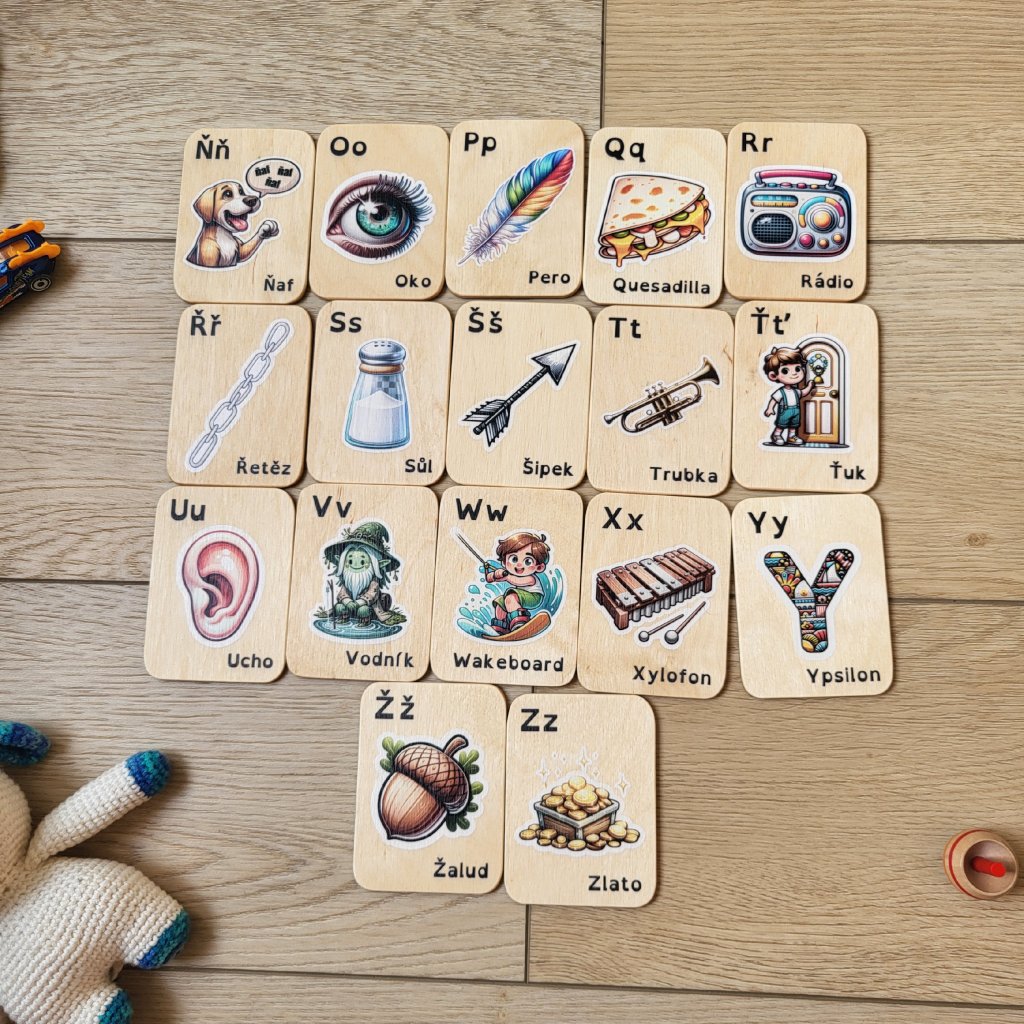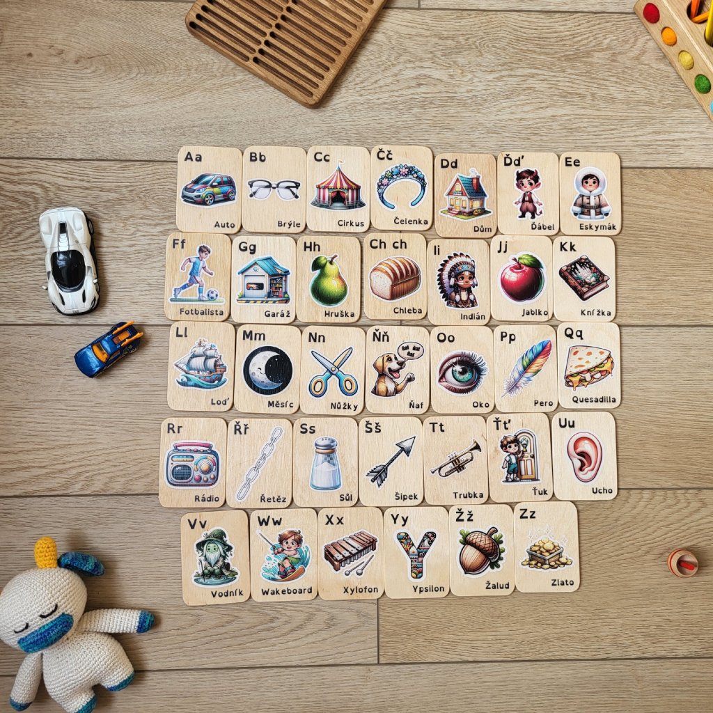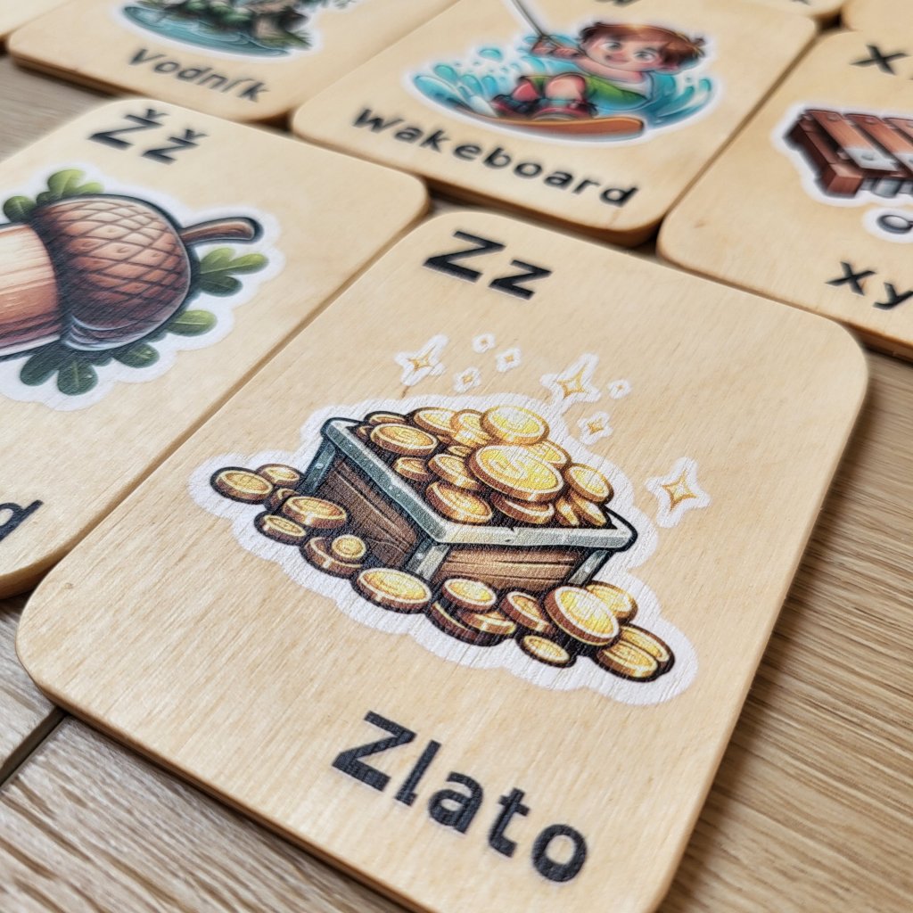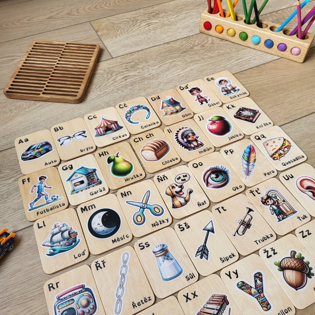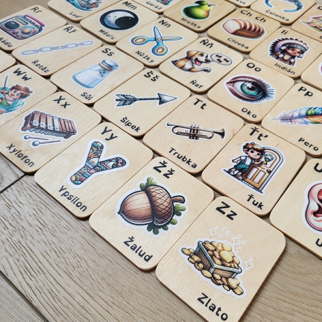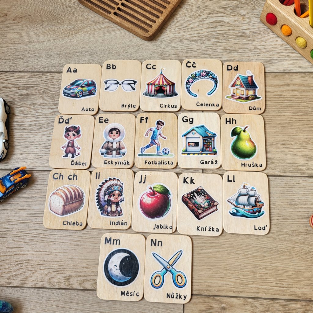 Dřevěná edukativní hra pro děti - Kartičky s obrázky předmětů a začátečními písmeny