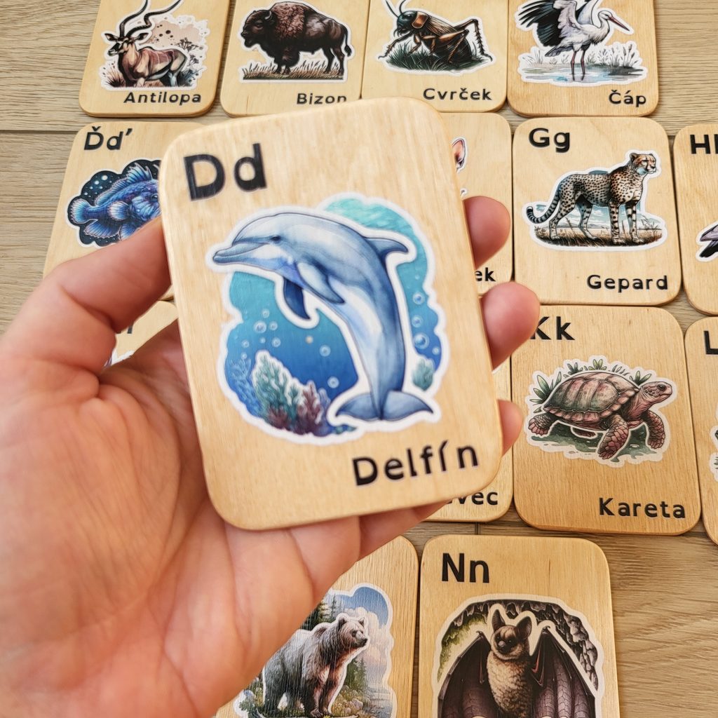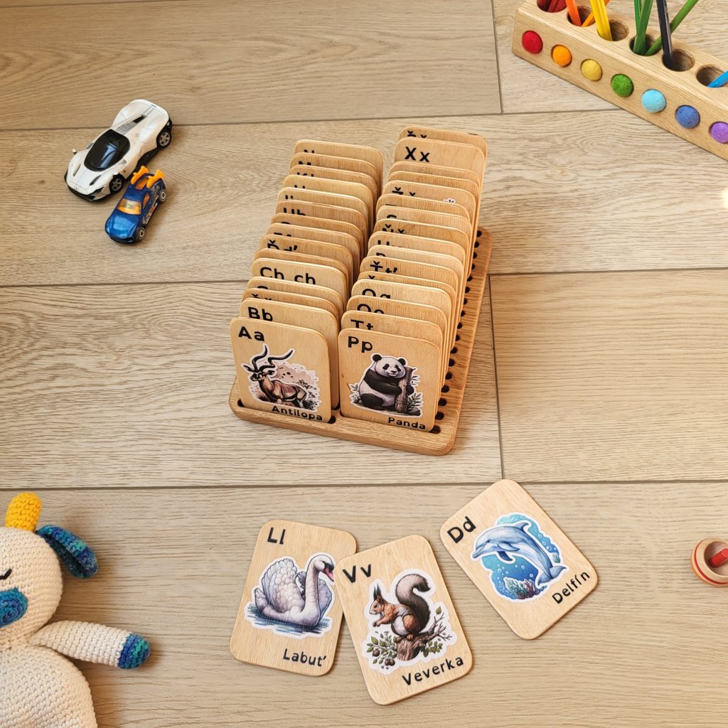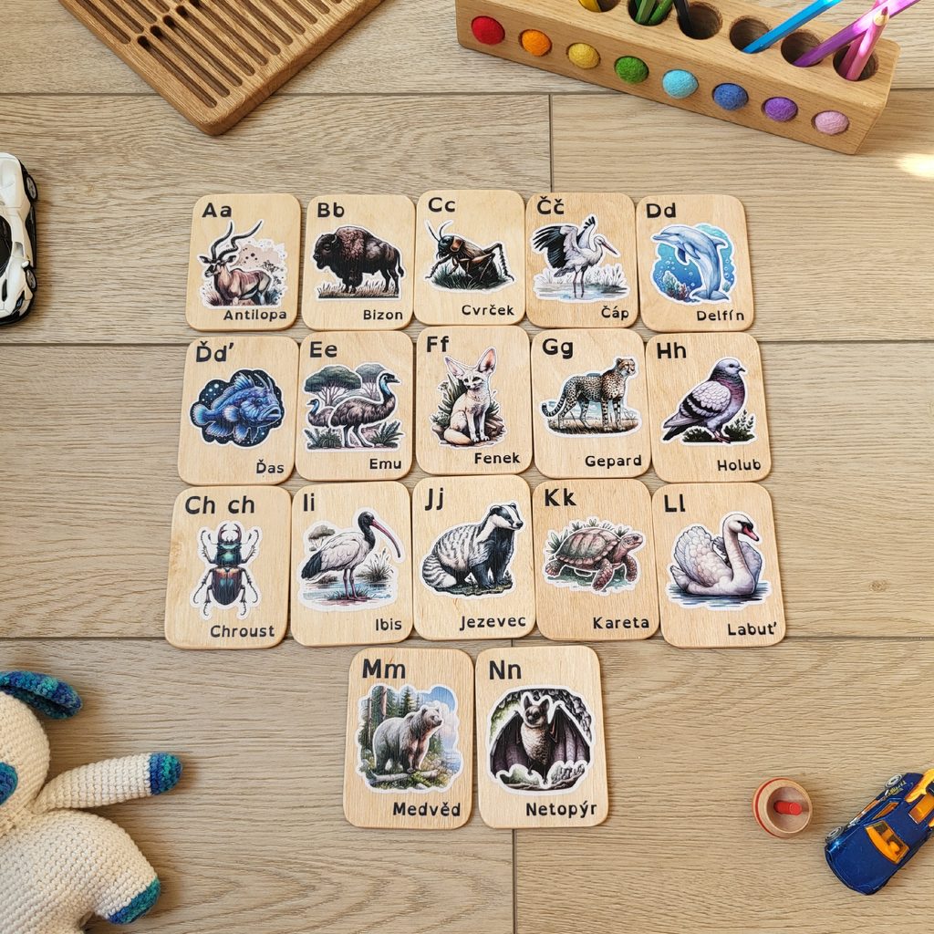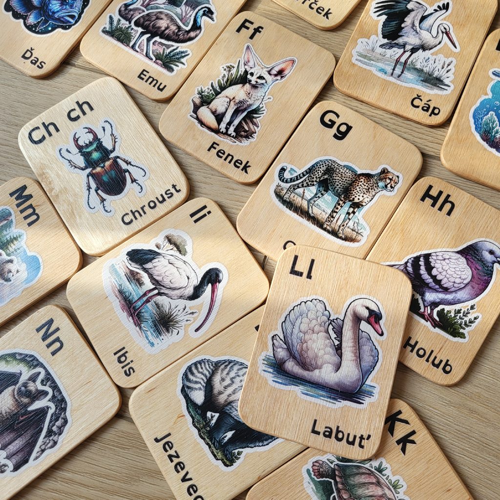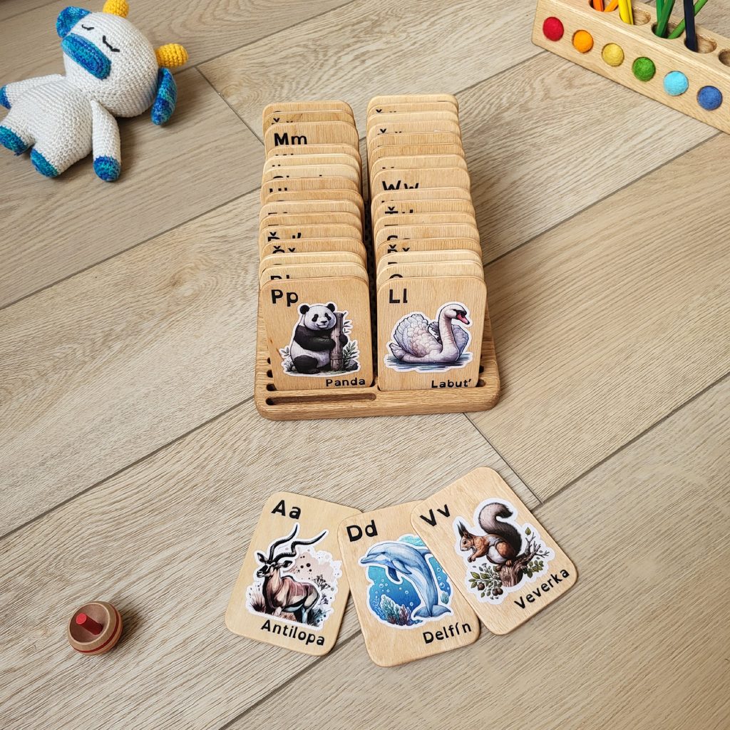 Dřevěná edukativní hra pro děti - Kartičky s obrázky zvířat a začátečními písmeny