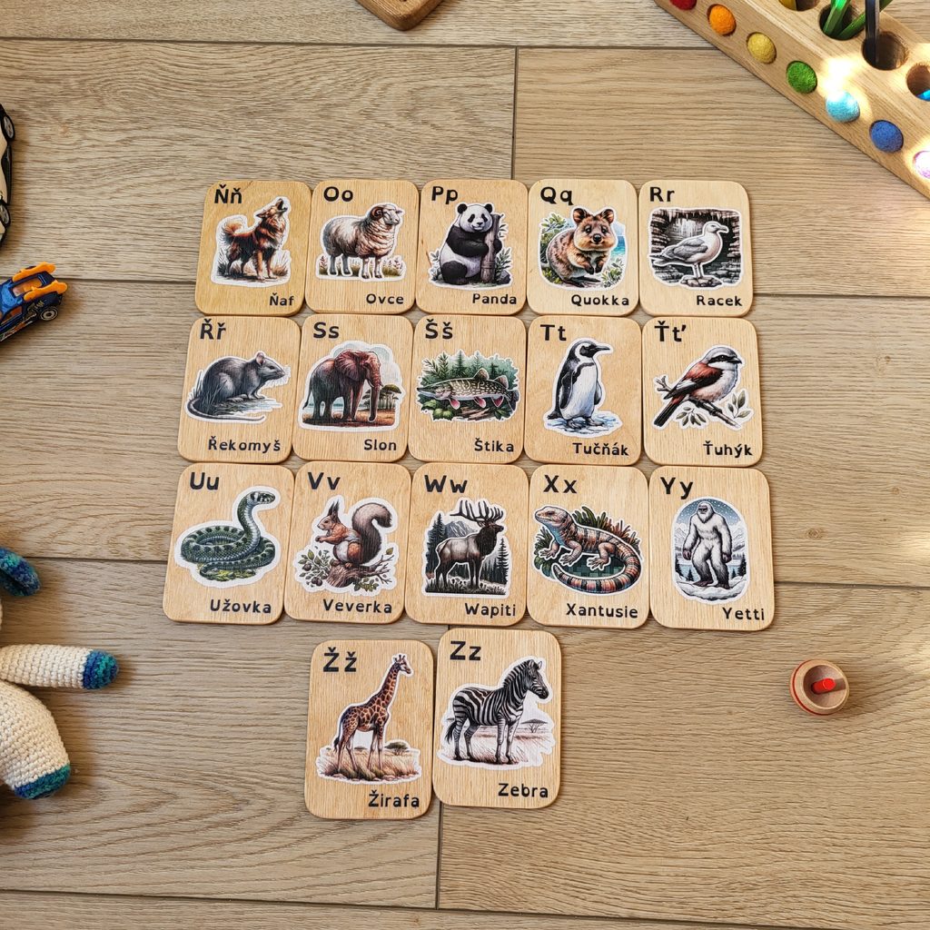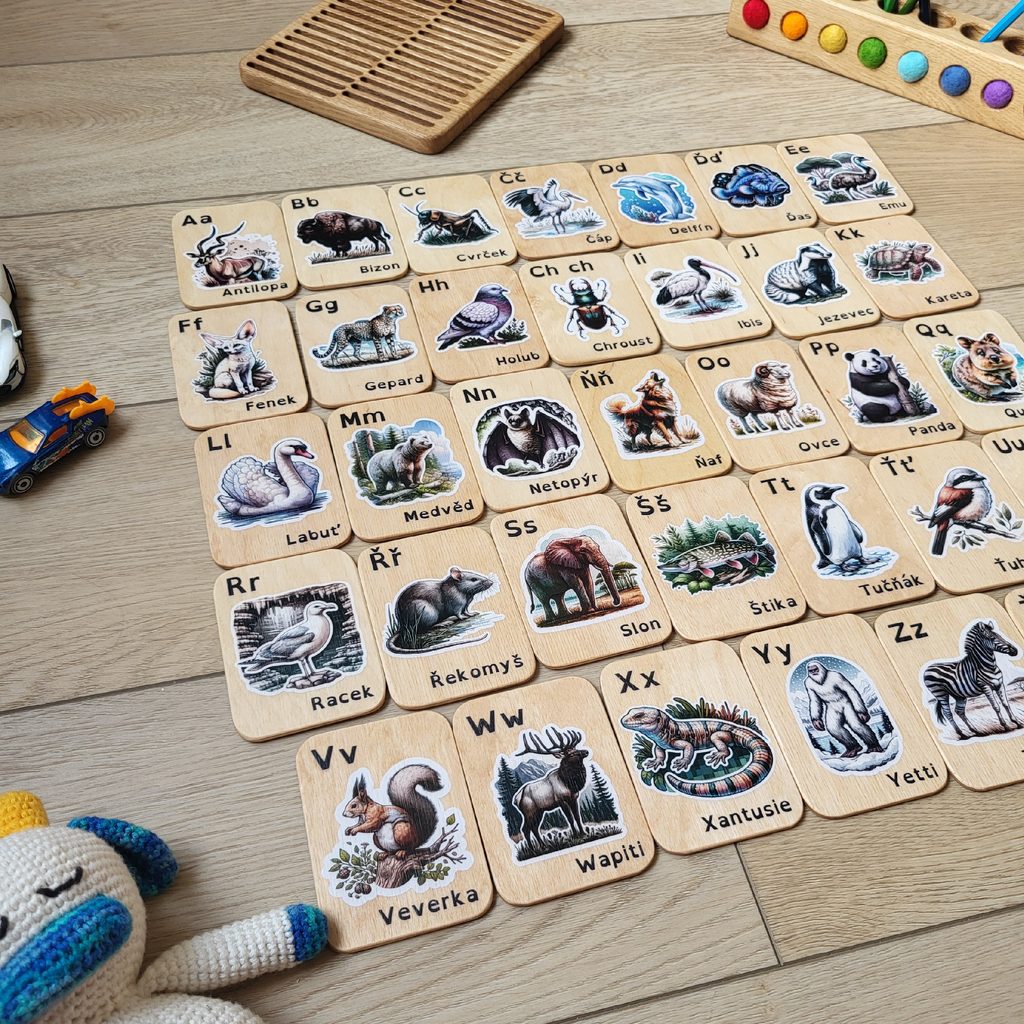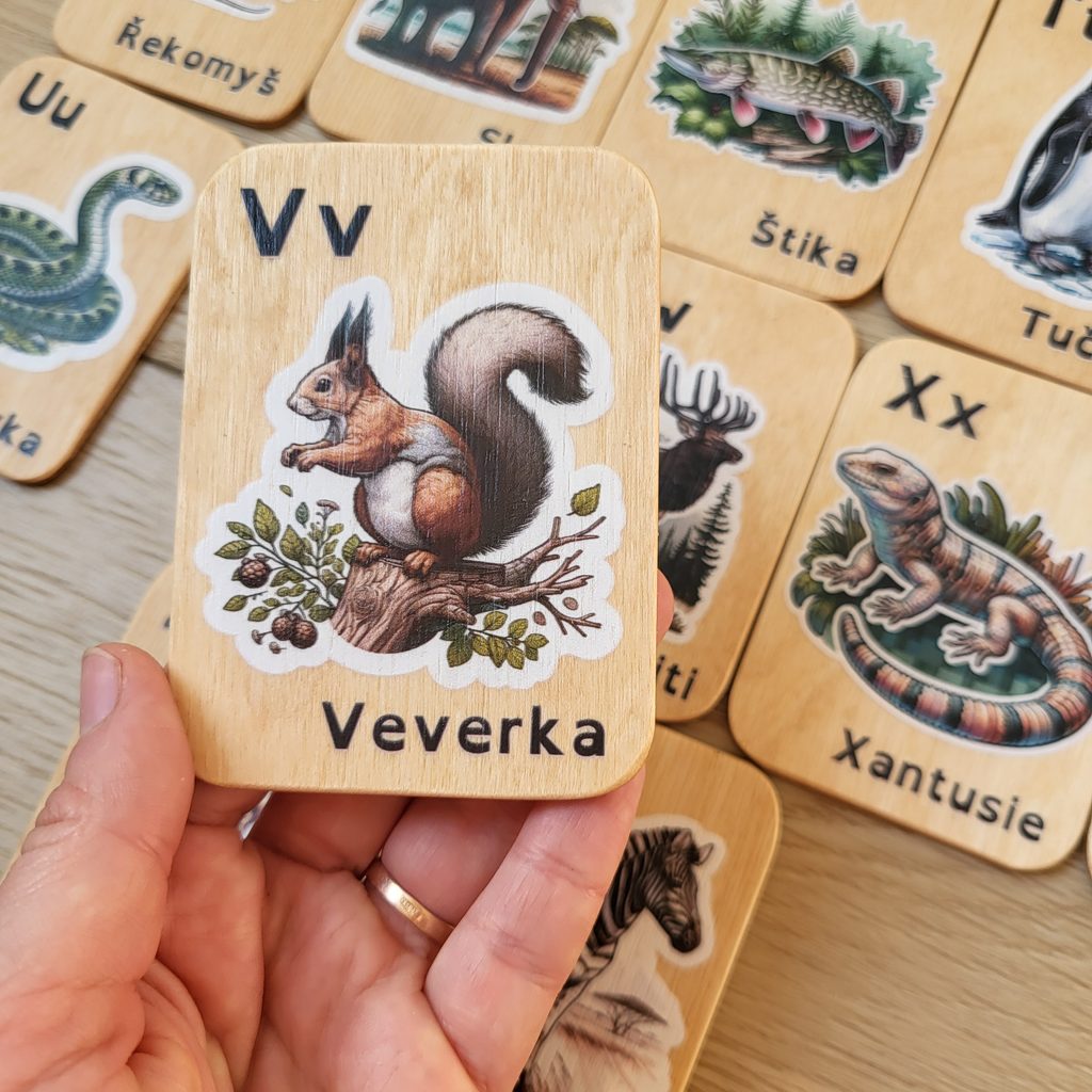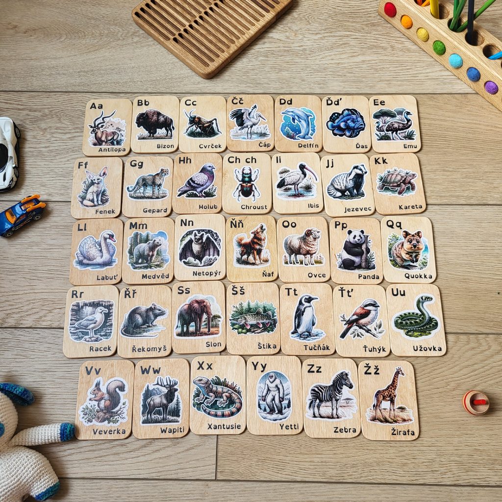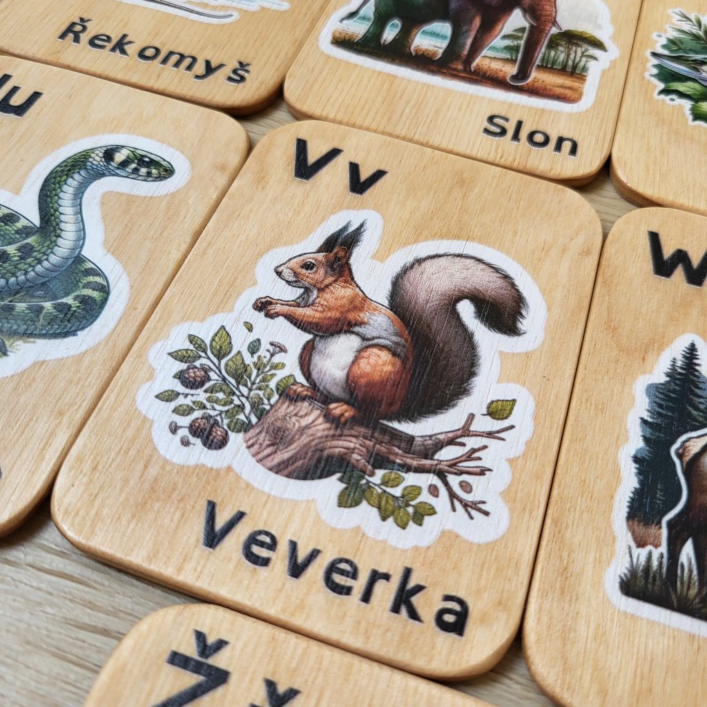 Dřevěná edukativní hra pro děti - Kartičky s obrázky zvířat a začátečními písmeny