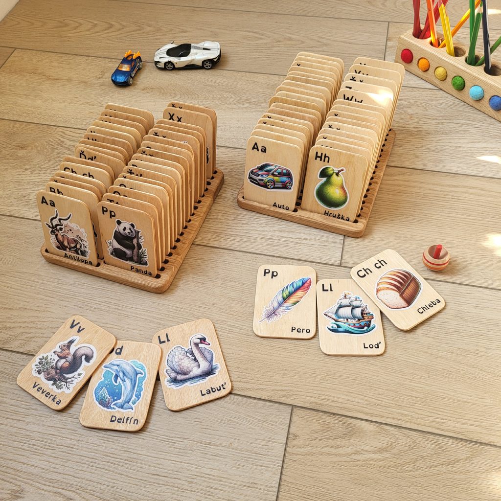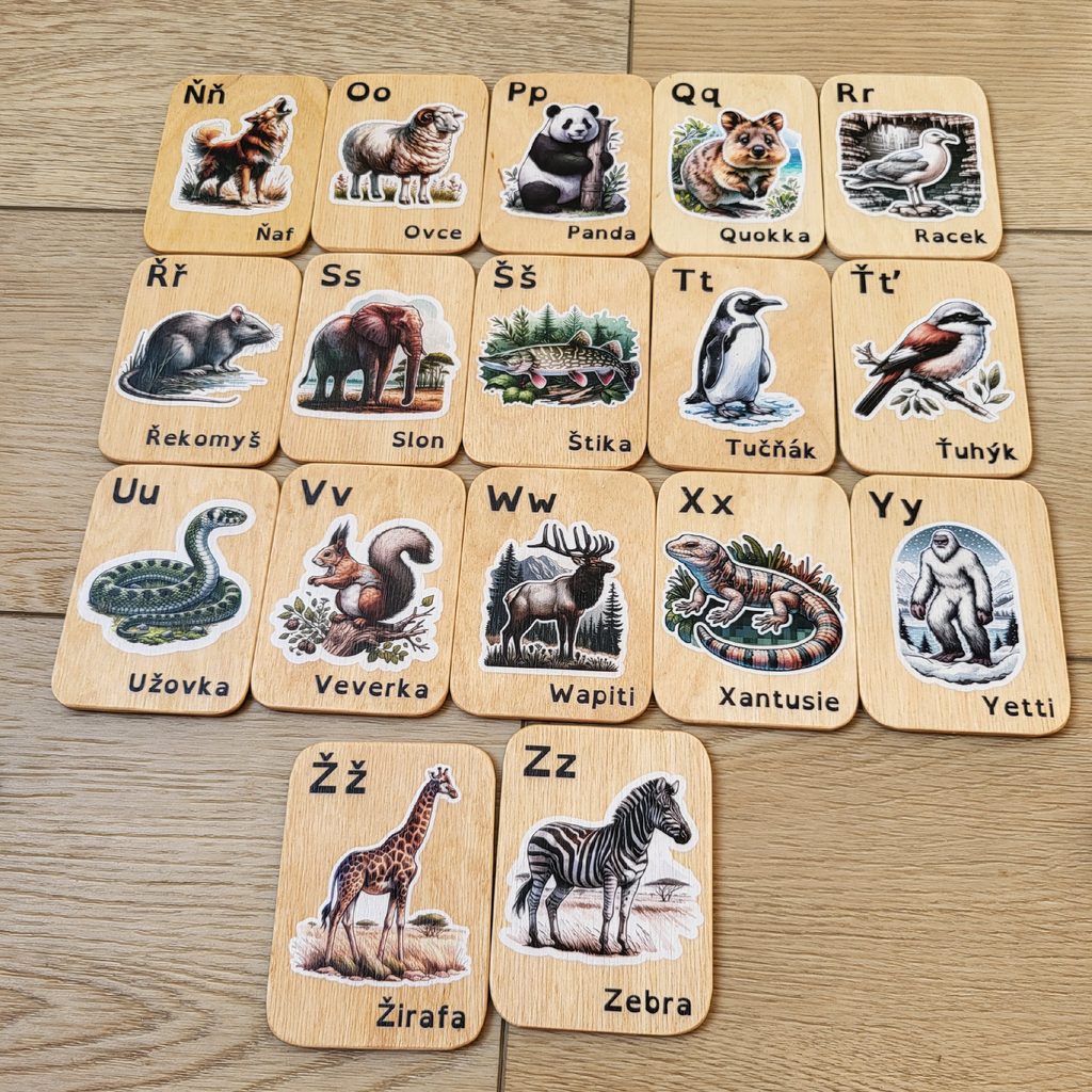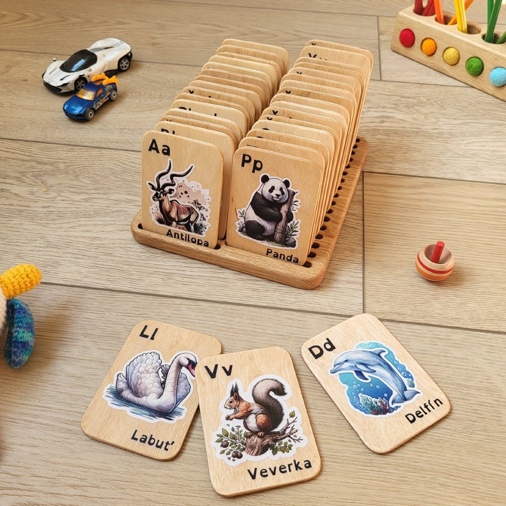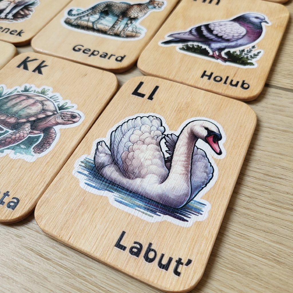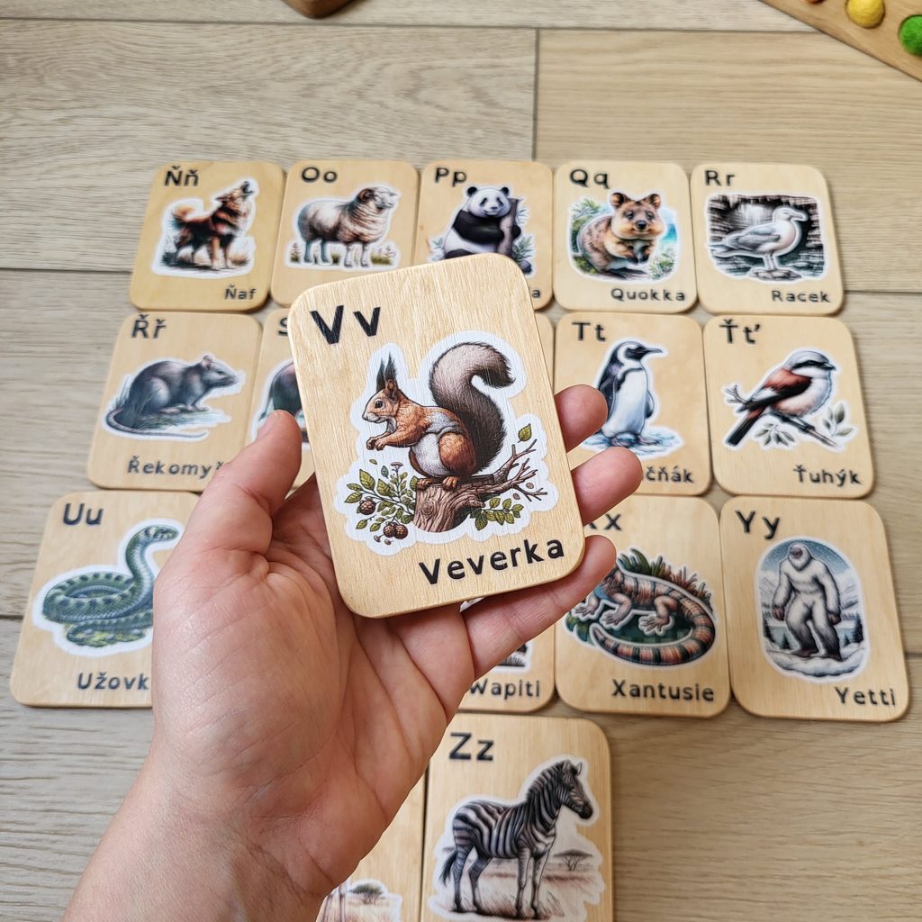 Dřevěná edukativní hra pro děti - Kartičky s obrázky zvířat a začátečními písmeny