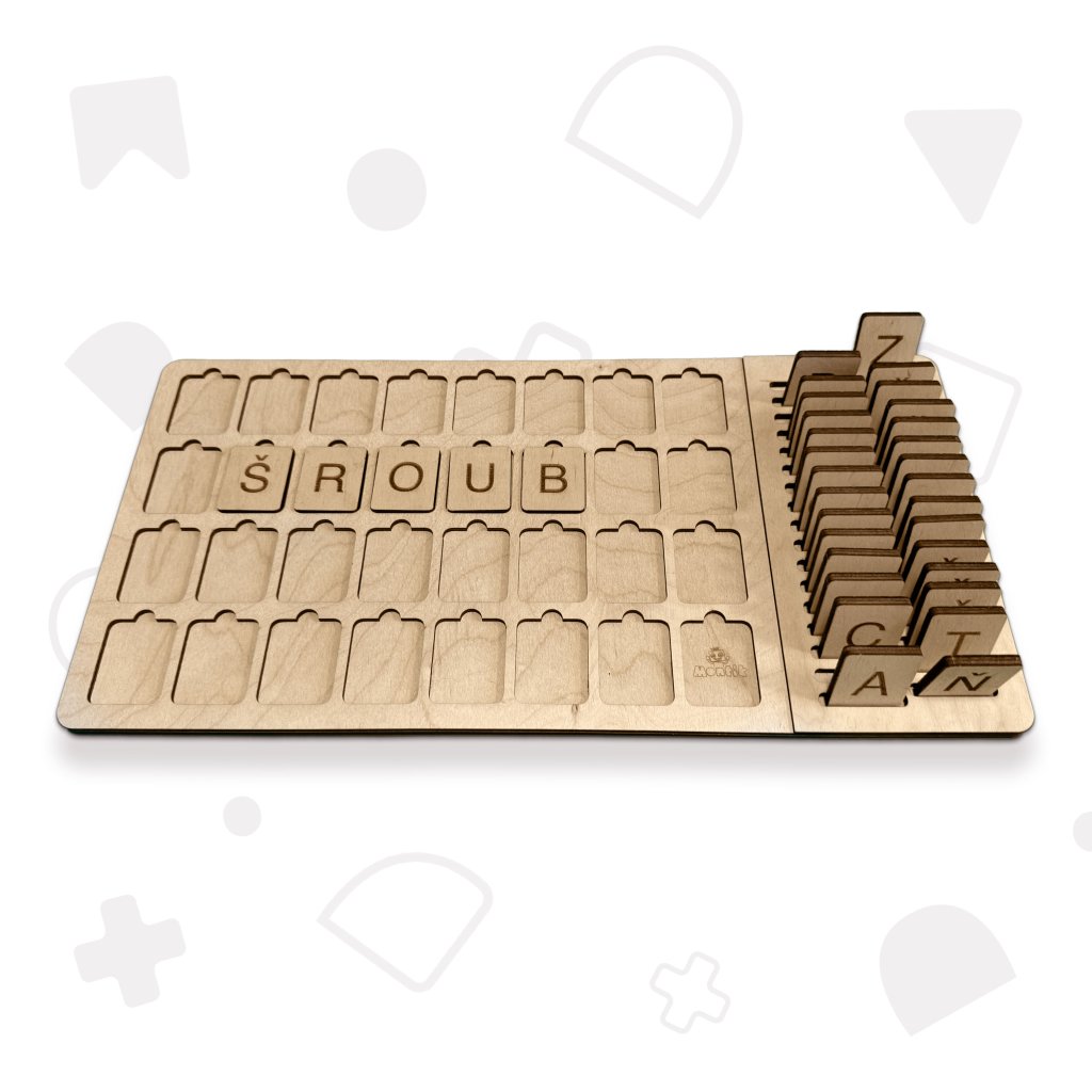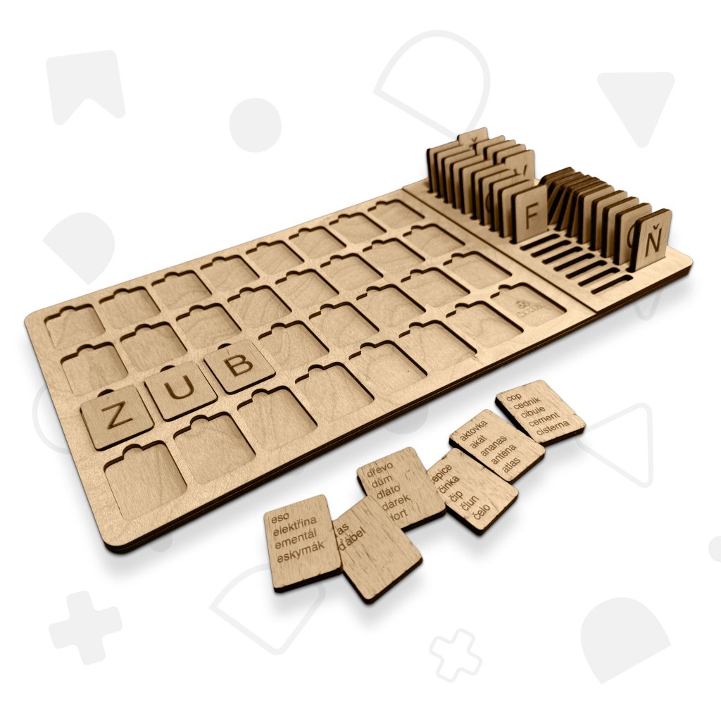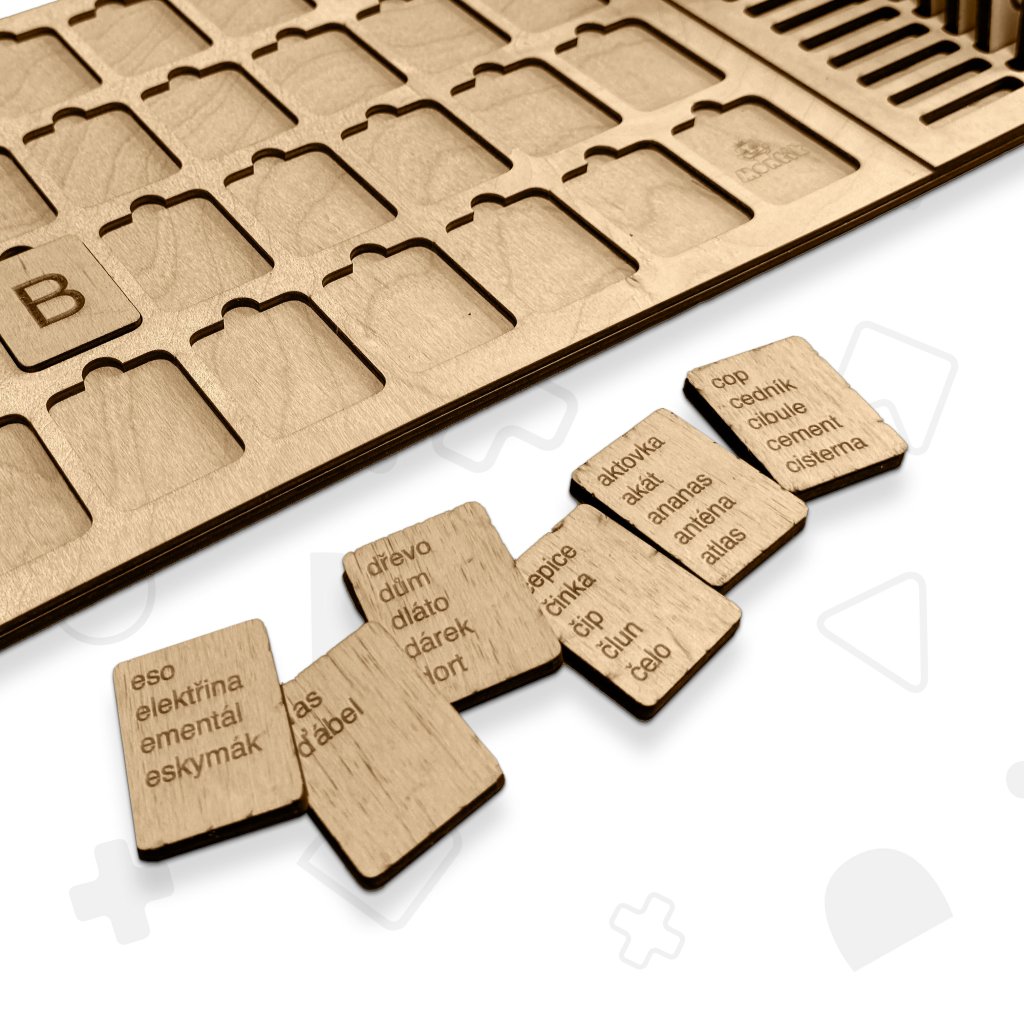 - dřevěná deska s poli pro umístění karet s písmeny a se zásobníkem na dřevěné karty
