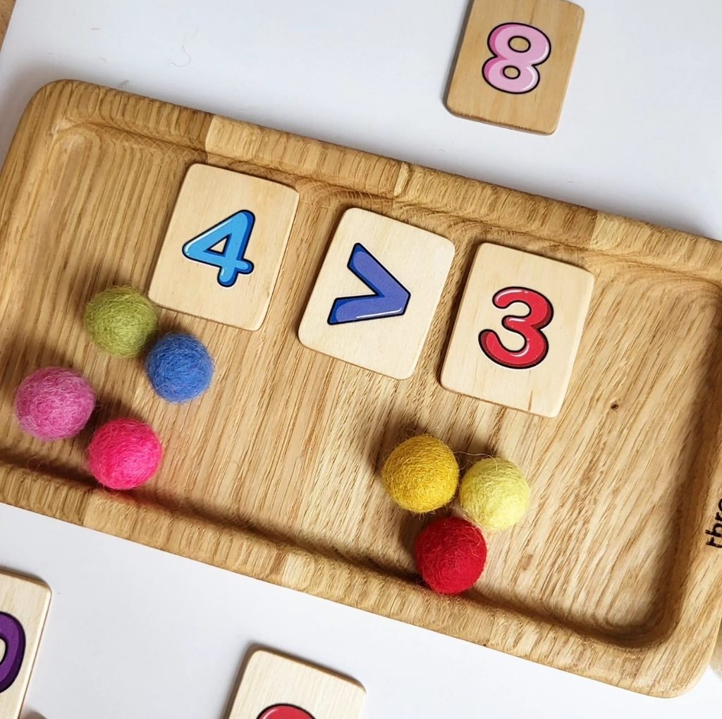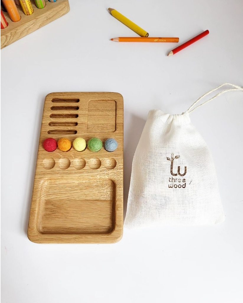 Položte kartičky s čísly na tác a dítě musí do otvorů vložit tolik kuliček, kolik je uvedeno na kartičkách. Tímto způsobem se dítě naučí čísla a naučí se počítat.