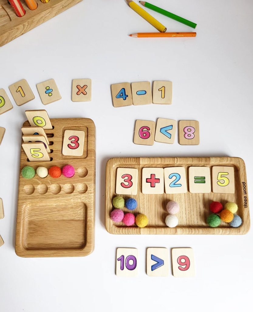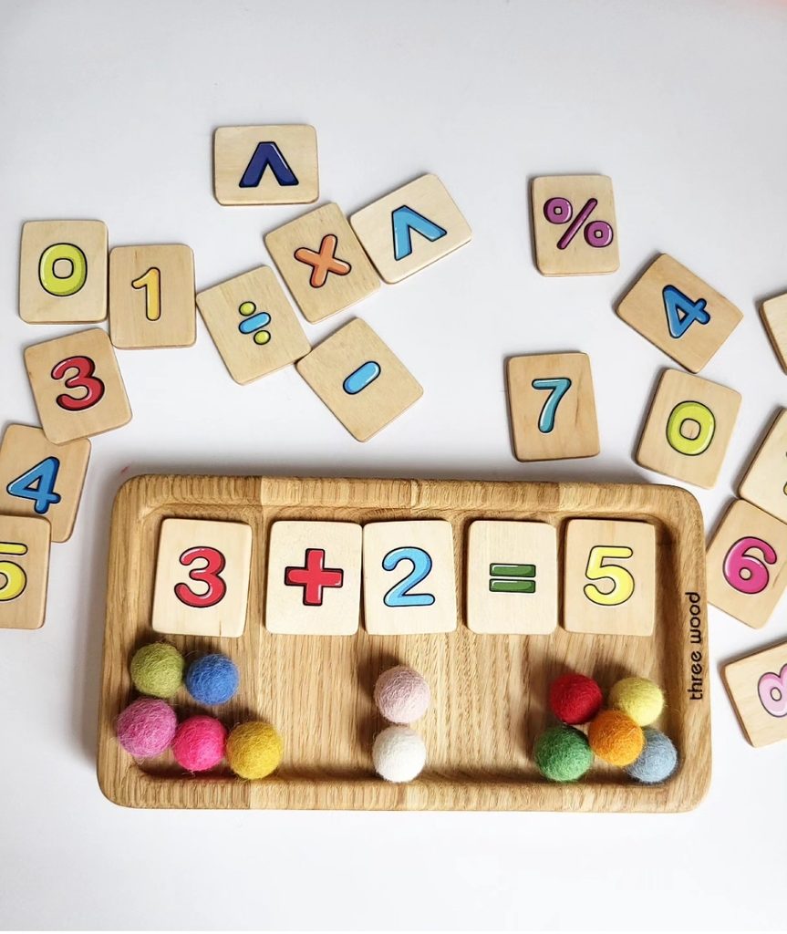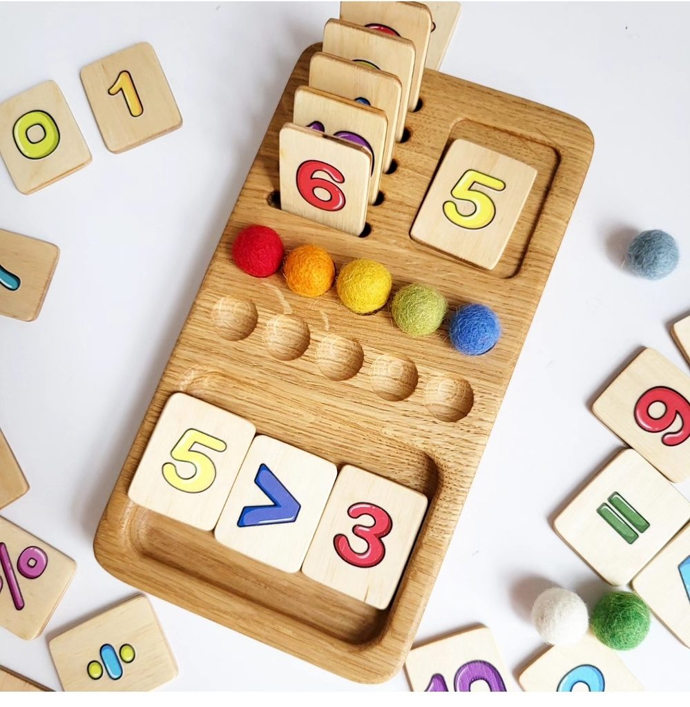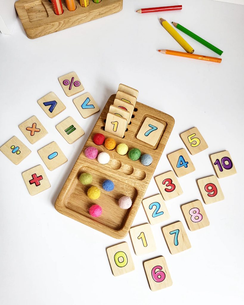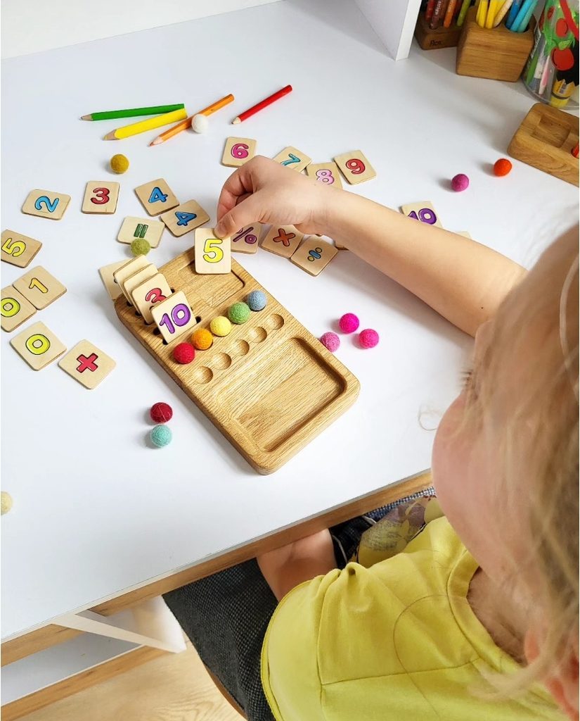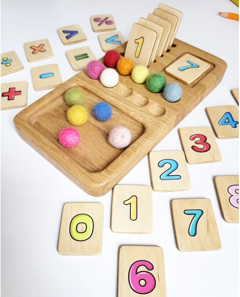 Dřevěná edukativní desková hra pro děti - matematická hra pro výuku čísel, sčítání a odčítání čísel do 10.