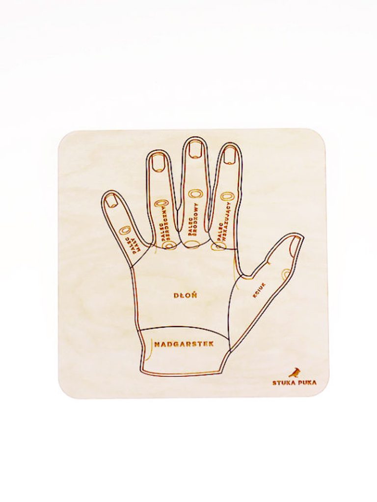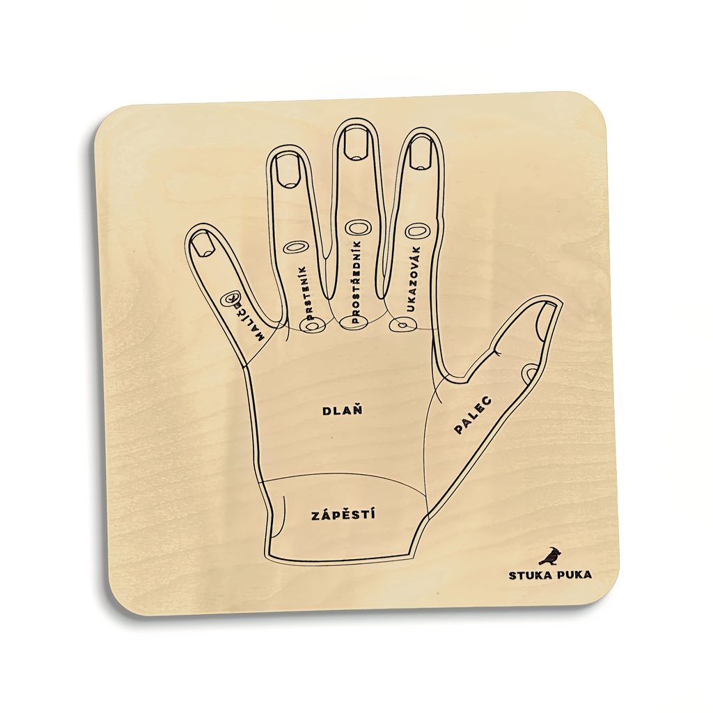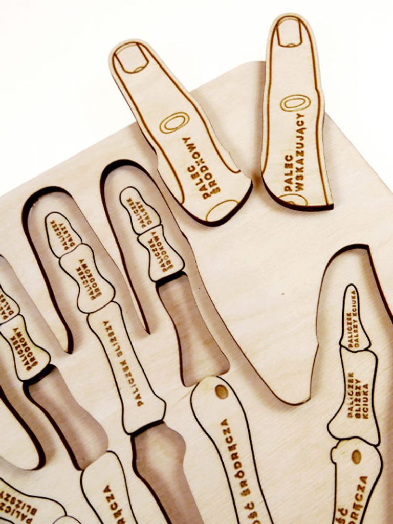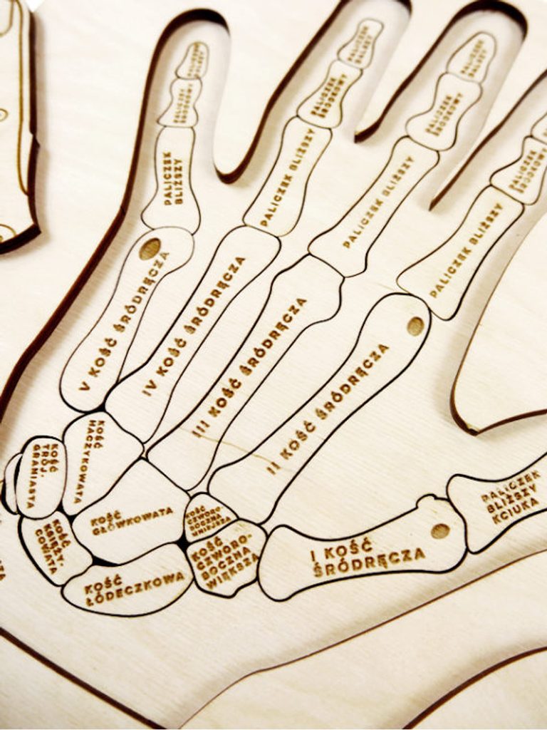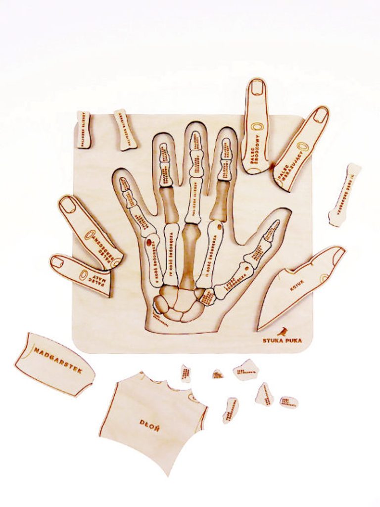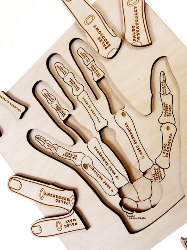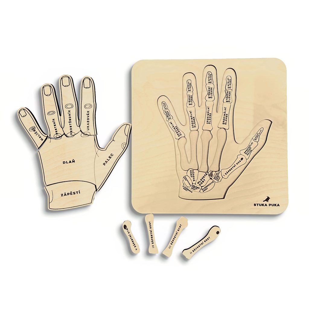 Dřevěné edukativní puzzle "Anatomie ruky" vás seznámí se stavbou ruky. Dvouúrovňová skládačka vám odpoví na otázky, jak se jmenují kosti a proč je v zápěstí až 8 kostí.