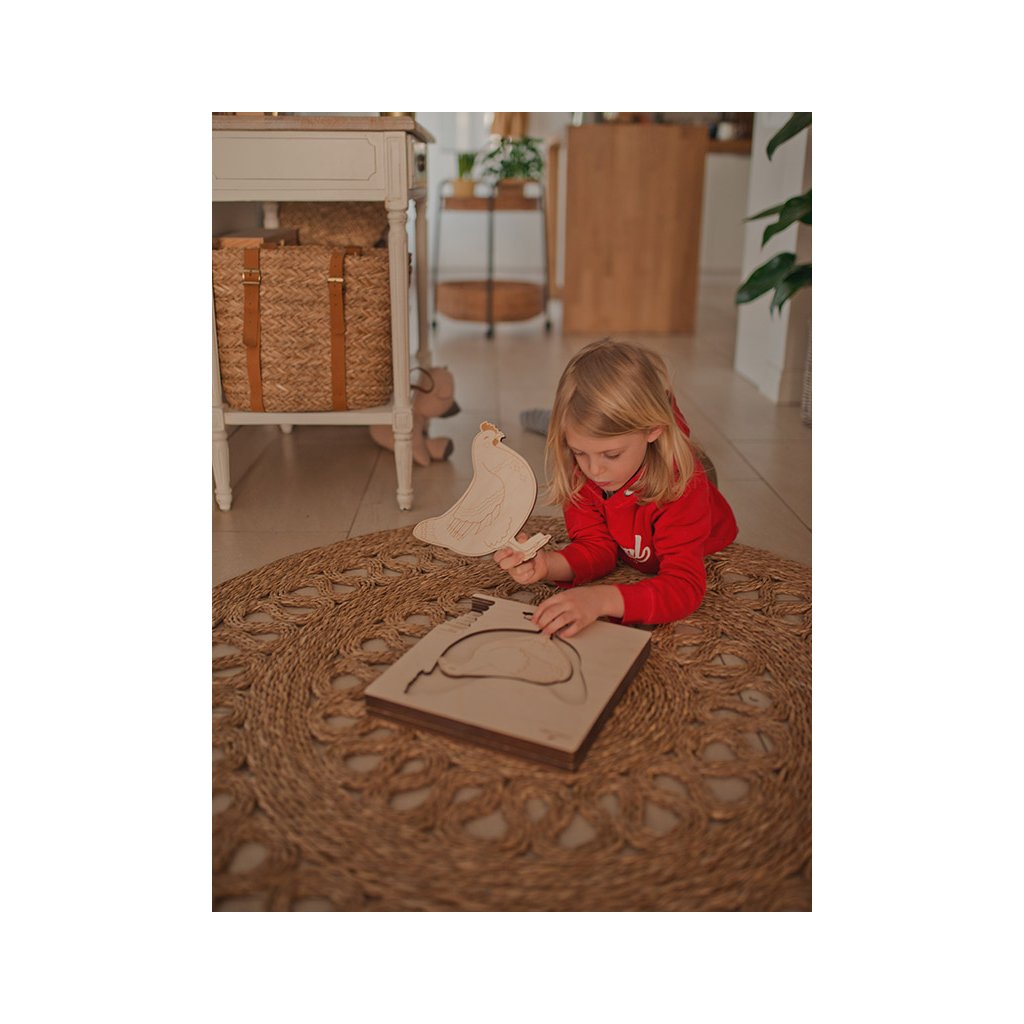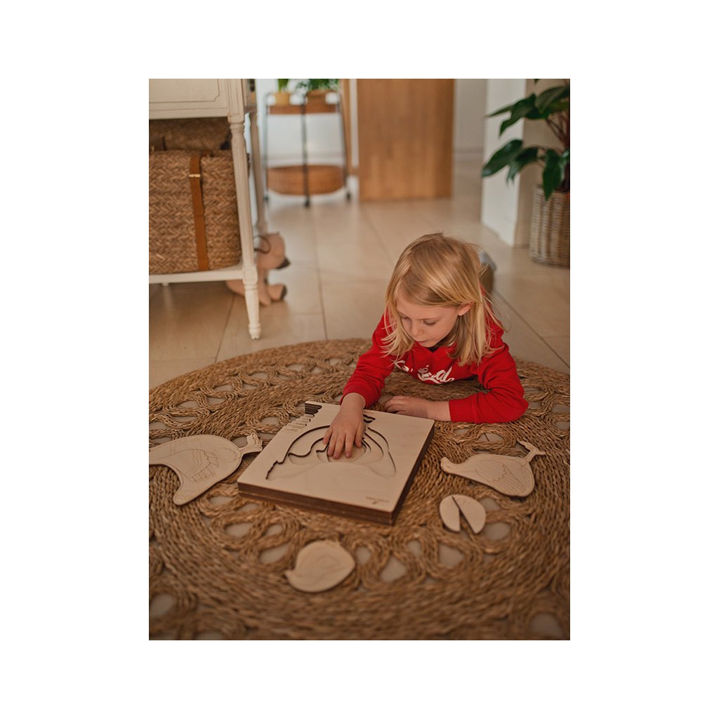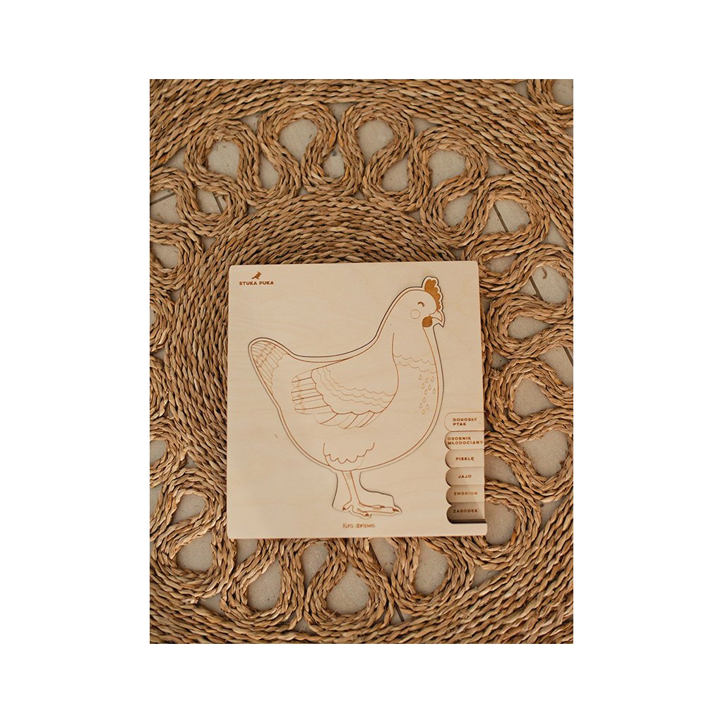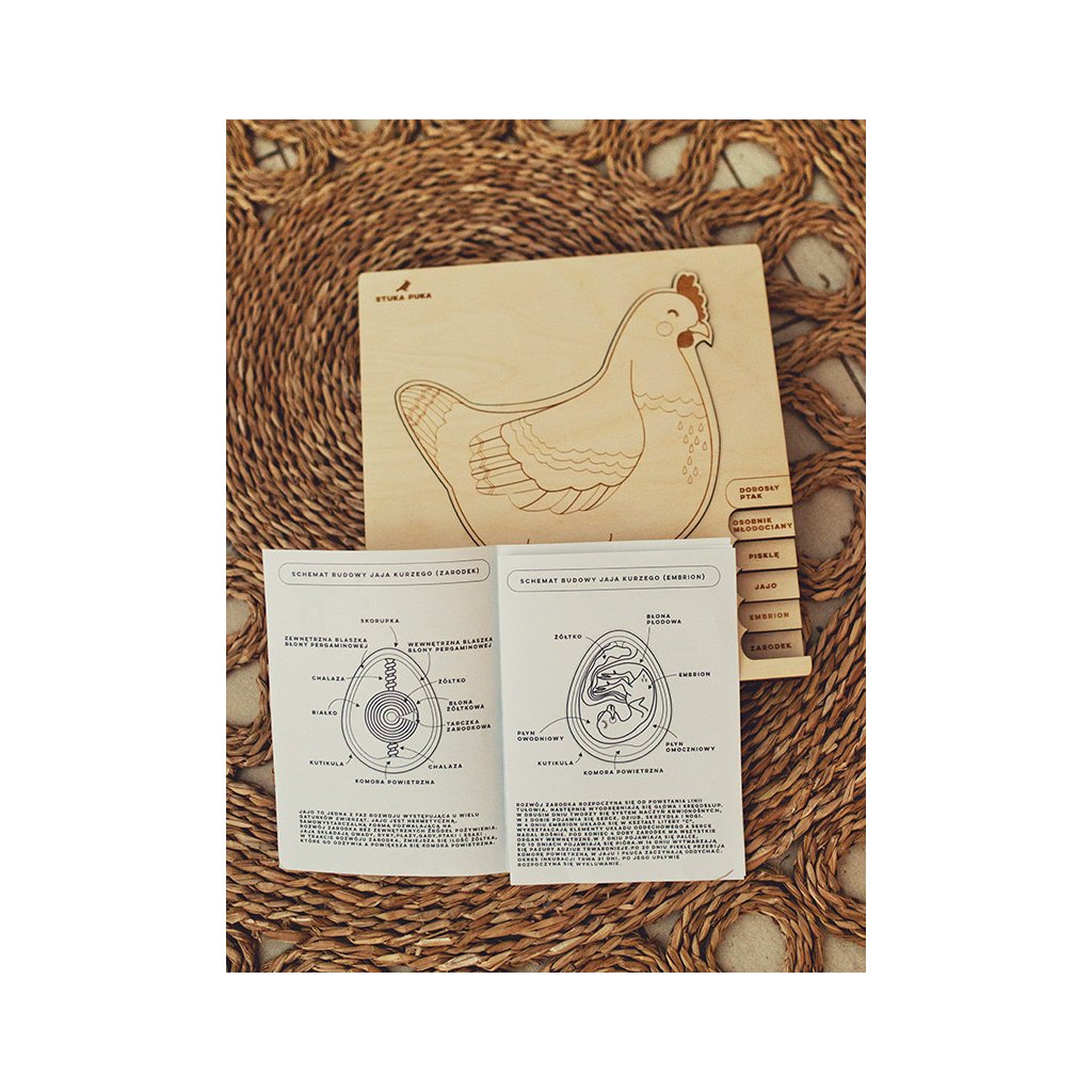 Šestistupňová skládačka/vkládačka 🎲 ukazuje rozdíl mezi mládětem a vyvinutým zárodkem ptáka. Děti si osvojí, z čeho se skládá skořápka a jak probíhá vývoj kuřete od vylíhnutí po dospělého jedince 🐥➡️🐔. Ke každému puzzle přidáváme vzdělávací brožuru "Od vajíčka ke kuřeti" 📘 plnou zajímavostí a dalších informací.