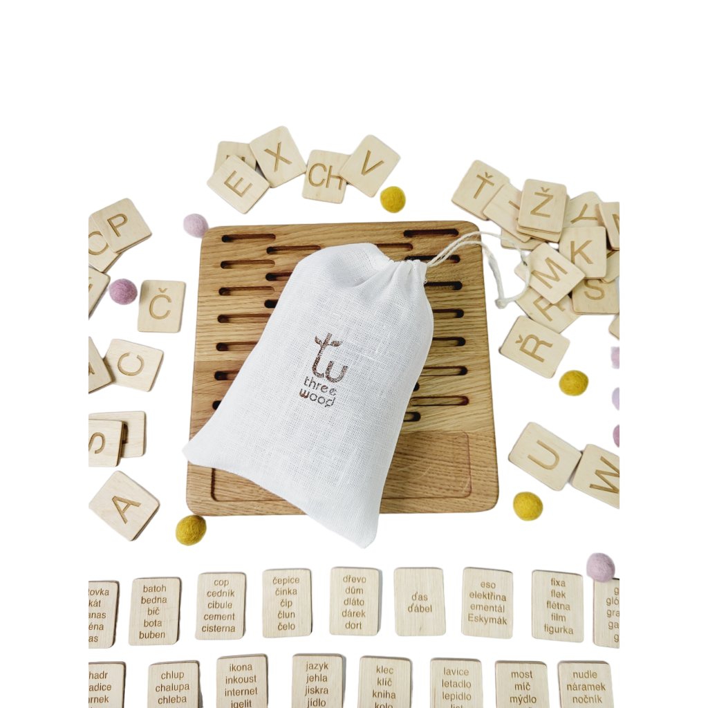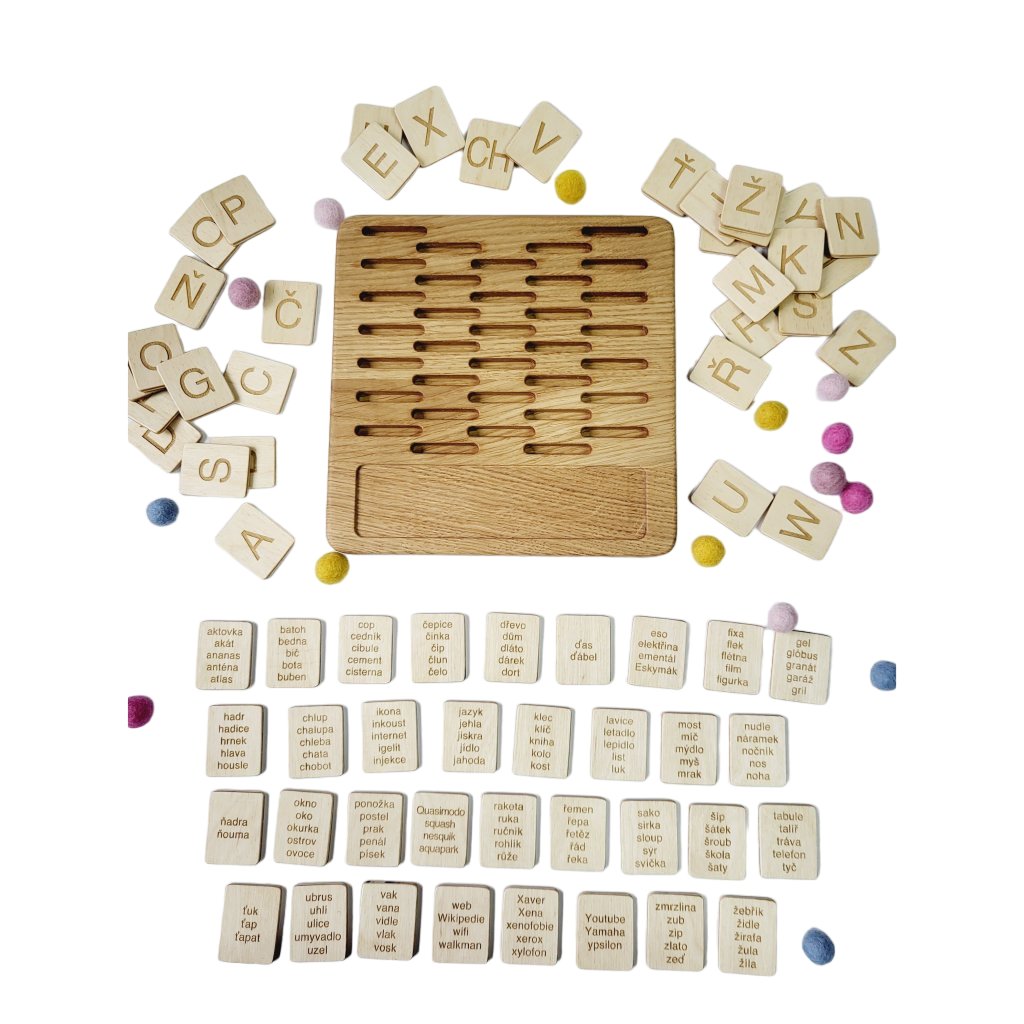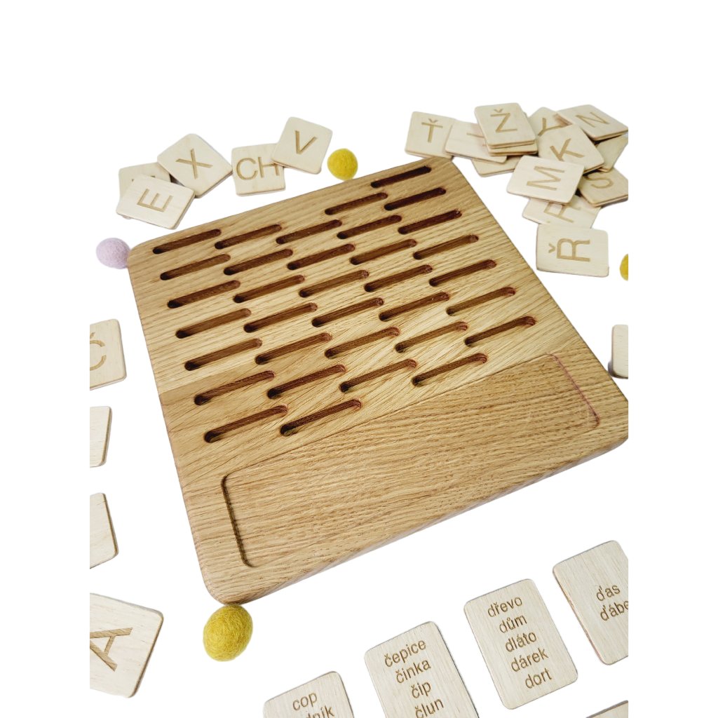 - oboustranná dřevěná deska (jedna strana - podklad pro umístění dřevěných karet s písmeny/slovy a pole pro vyskládání slova z karet, druhá strana - podklad pro hru s písmeny)