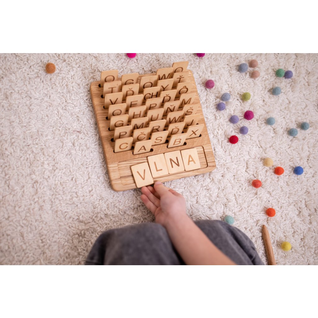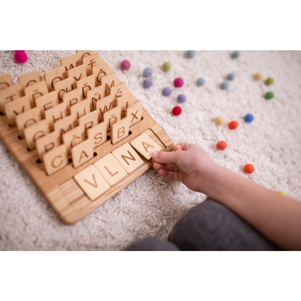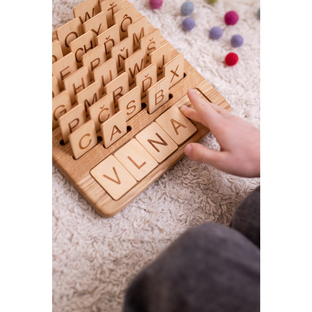 Montessori dřevěná edukativní desková hra pro děti - abecední hra pro děti, se kterou se učí písmena a snaží se vytvářet slova.