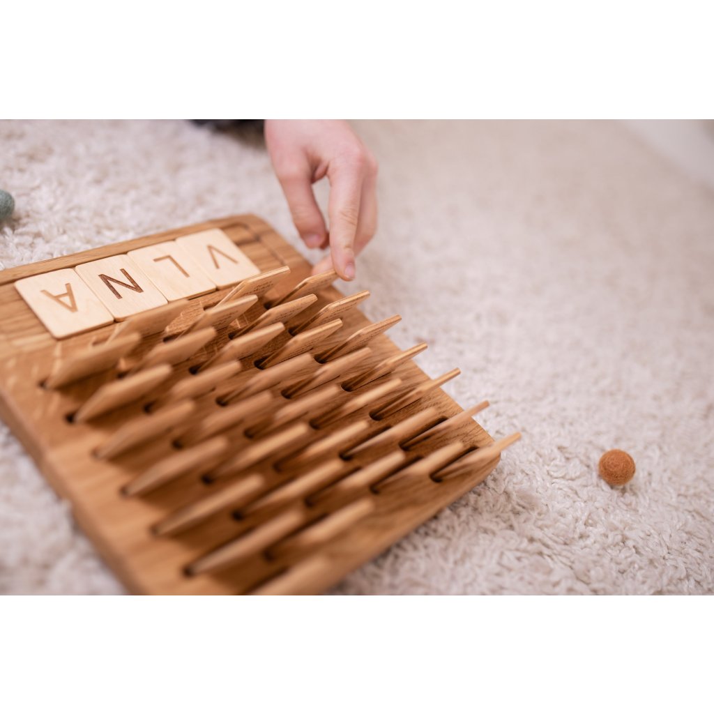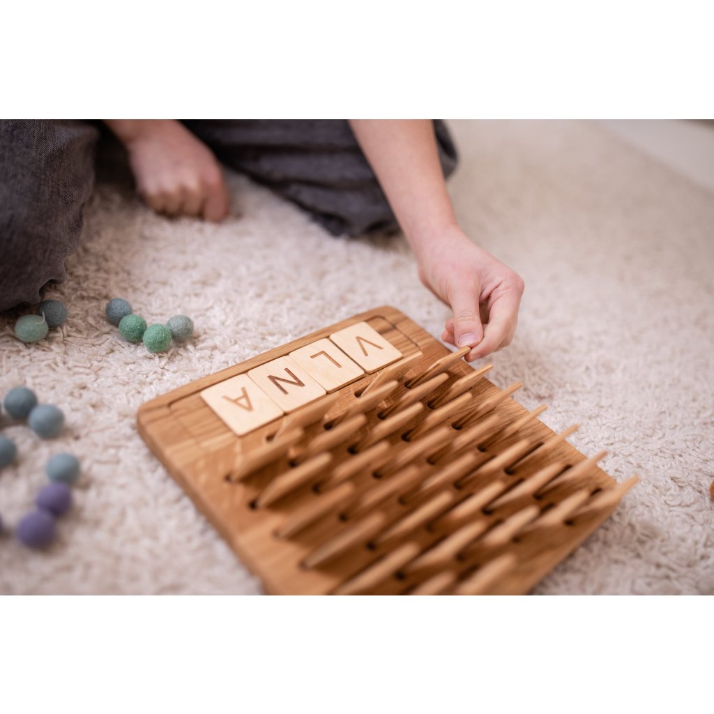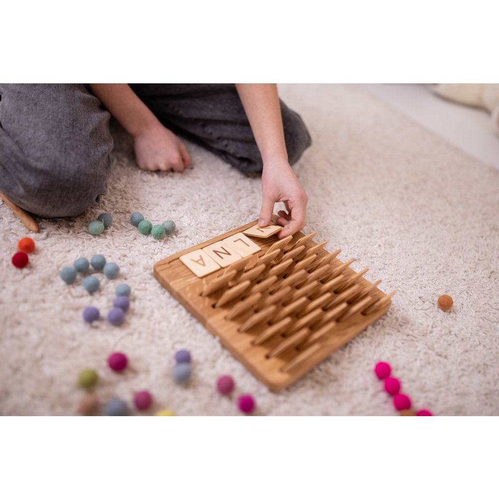 Montessori dřevěná edukativní desková hra pro děti - abecední hra pro děti, se kterou se učí písmena a snaží se vytvářet slova.
