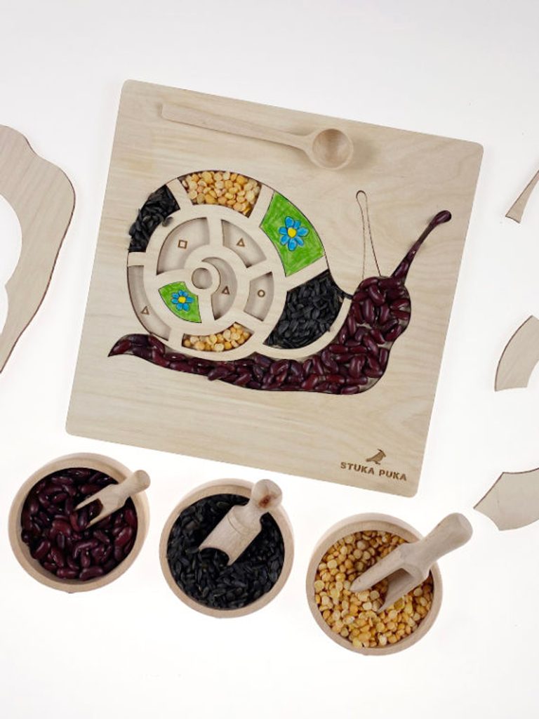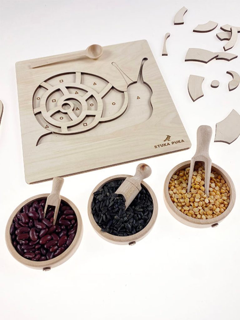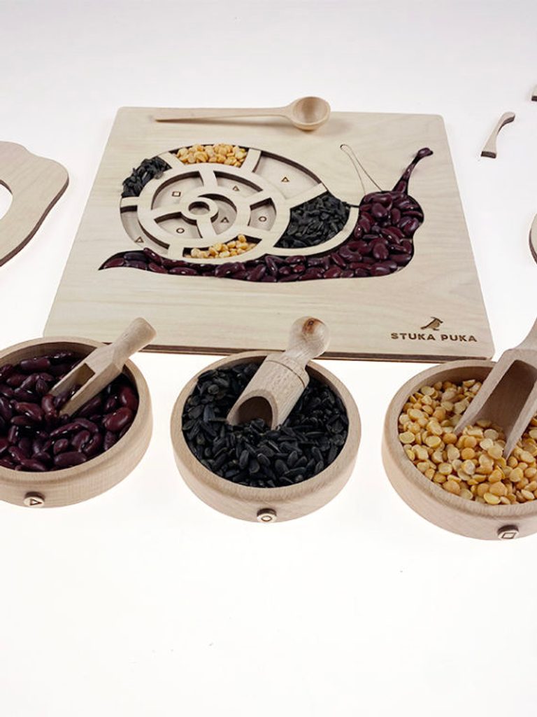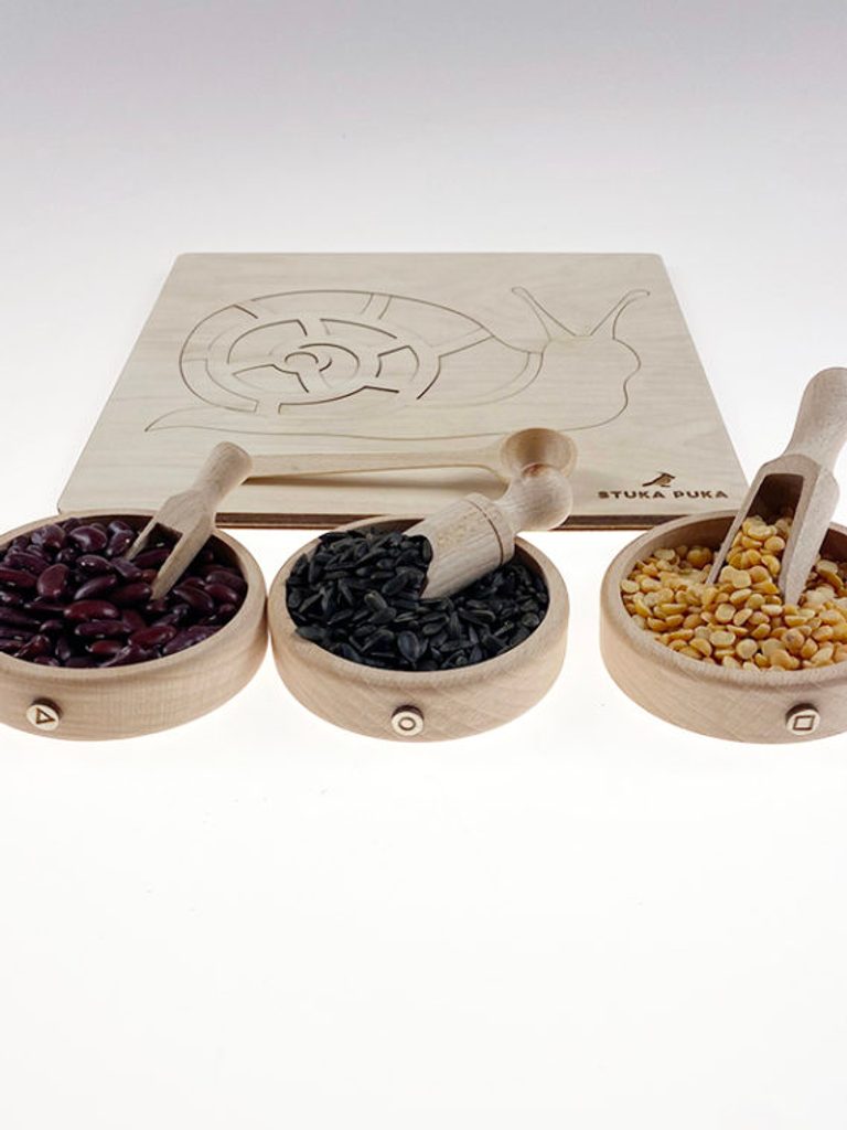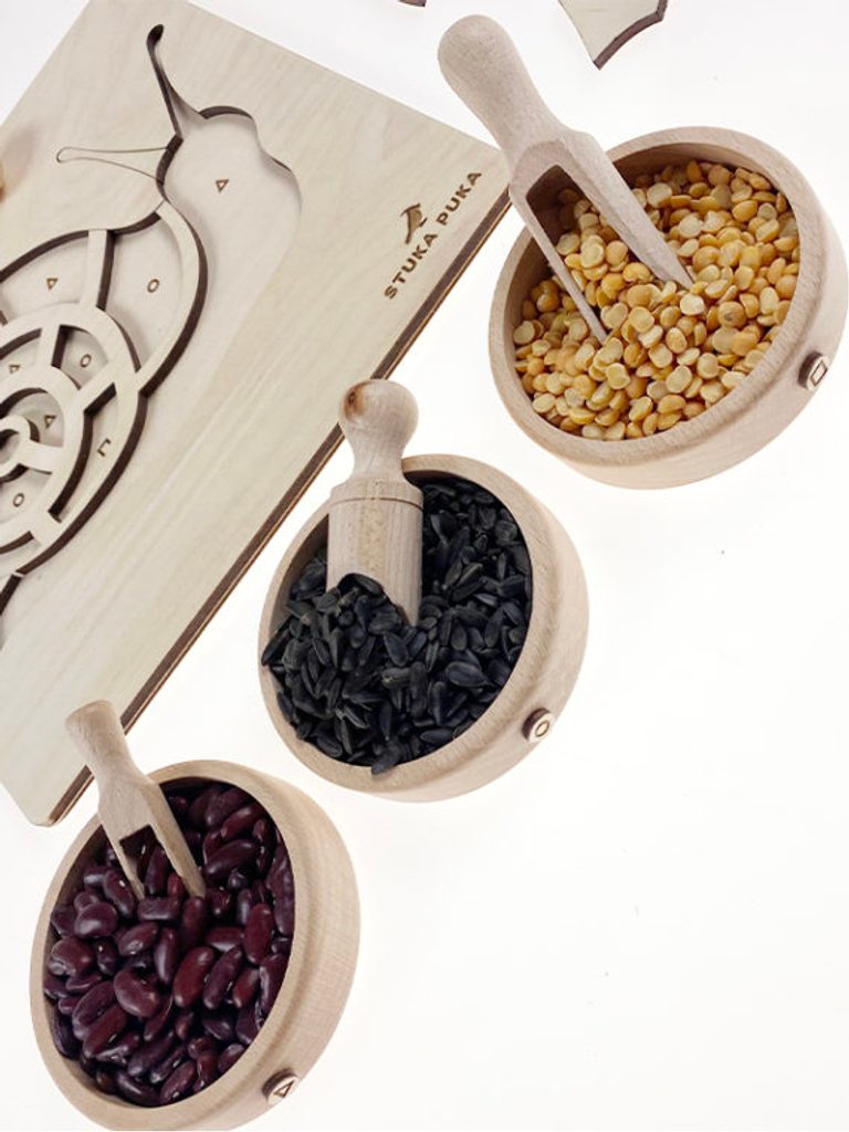 Čtyři různé naběračky a lžička rozšíří hru o různé způsoby nabírání a nalévání. Vaše dítě může vytvářet obrazce podle kódu nebo volně manipulovat s jednotlivými přihrádkami.