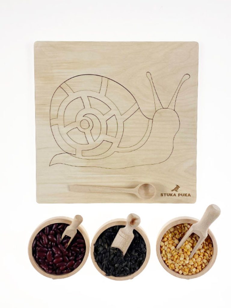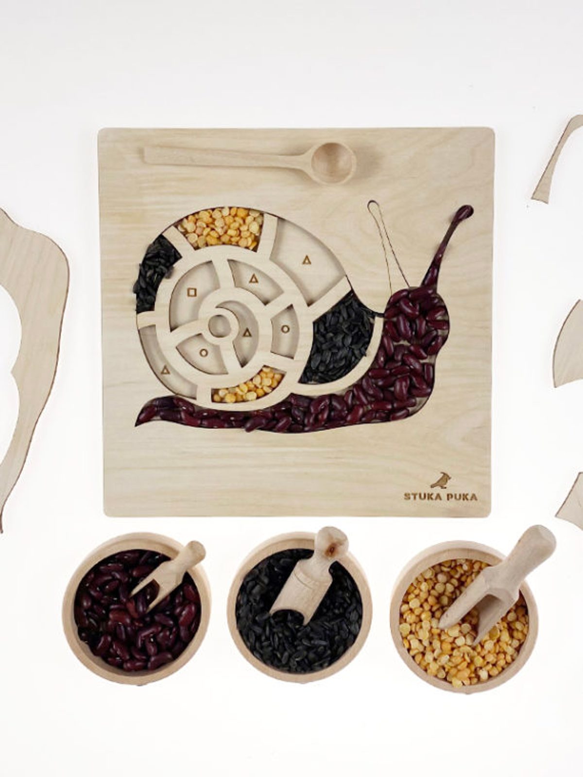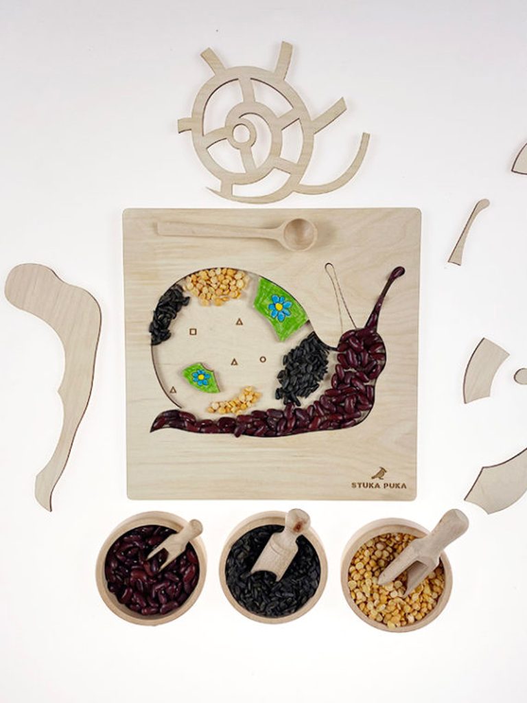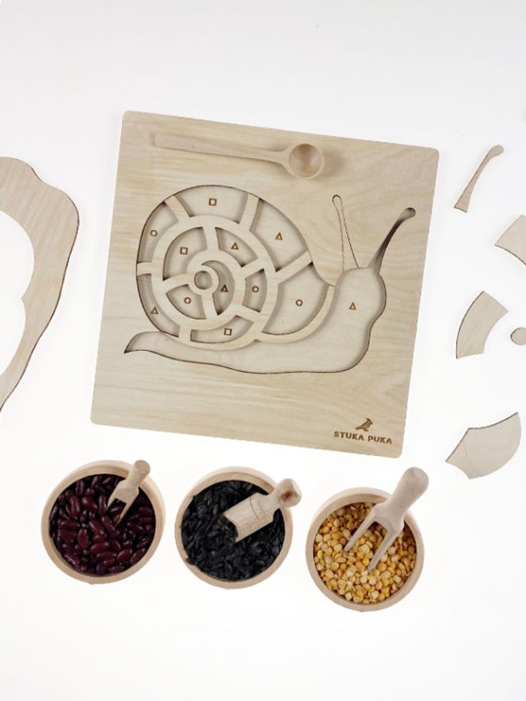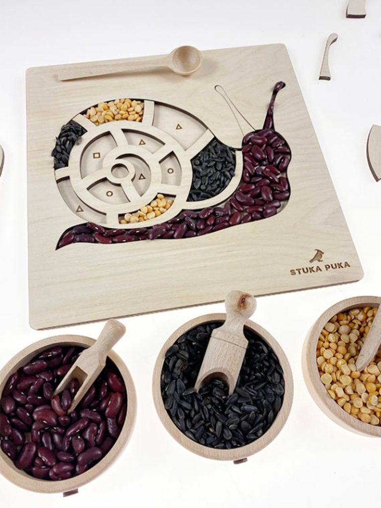 Čtyři různé naběračky a lžička rozšíří hru o různé způsoby nabírání a nalévání. Vaše dítě může vytvářet obrazce podle kódu nebo volně manipulovat s jednotlivými přihrádkami.