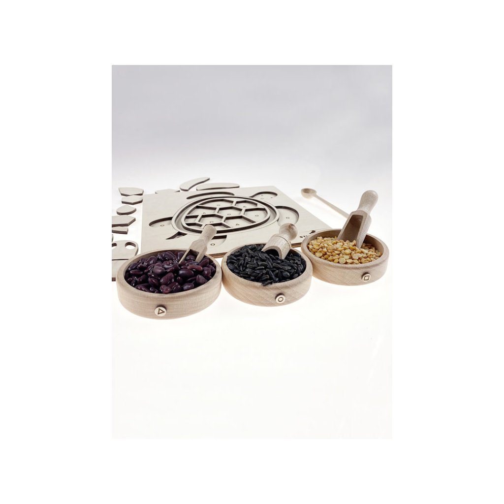 Čtyři různé naběračky a lžička rozšíří hru o různé způsoby nabírání a nalévání. Vaše dítě může vytvářet obrazce podle kódu nebo volně manipulovat s jednotlivými přihrádkami.