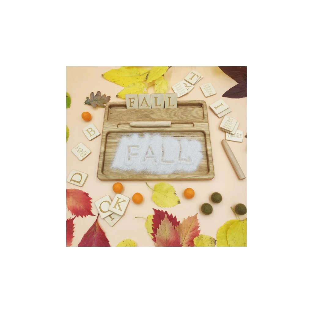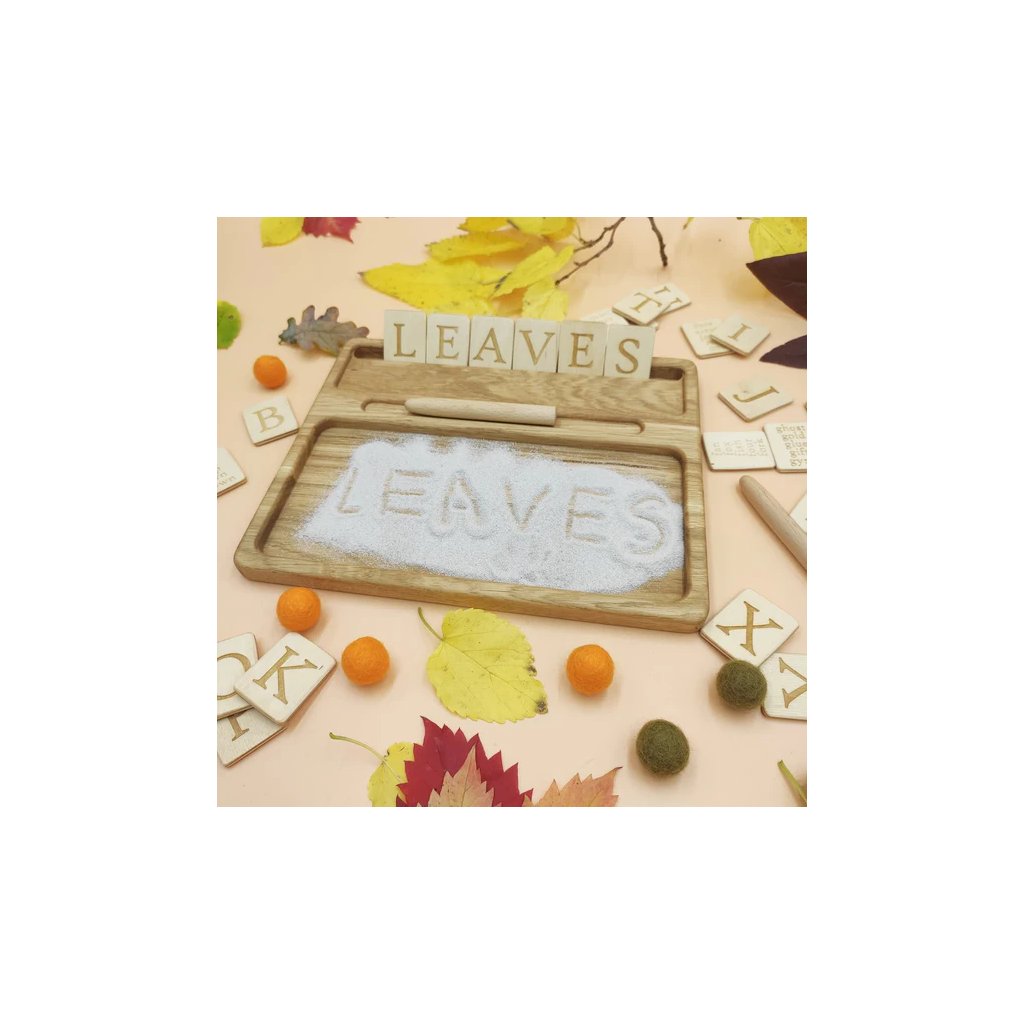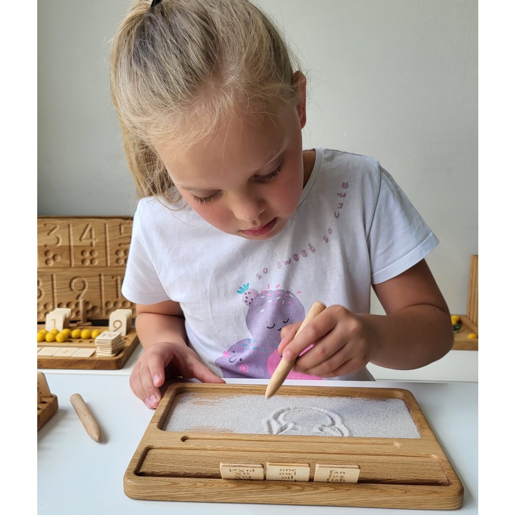 Tato Montessori dřevěná tabulka vyrobená z dubového dřeva a ošetřena přírodním olejem je určená pro psaní do písku. Jedná se o skvělou vzdělávací pomůcku pro děti, kde se naučí psát písmena, číslice, tvary nebo čáry.