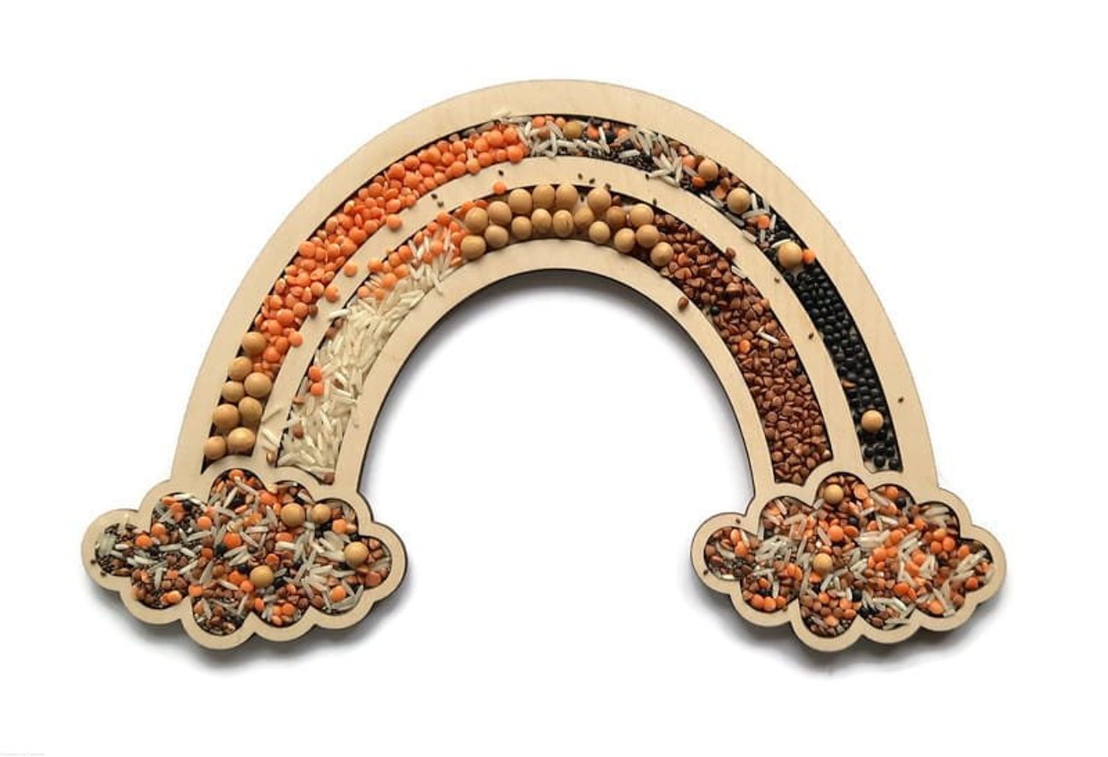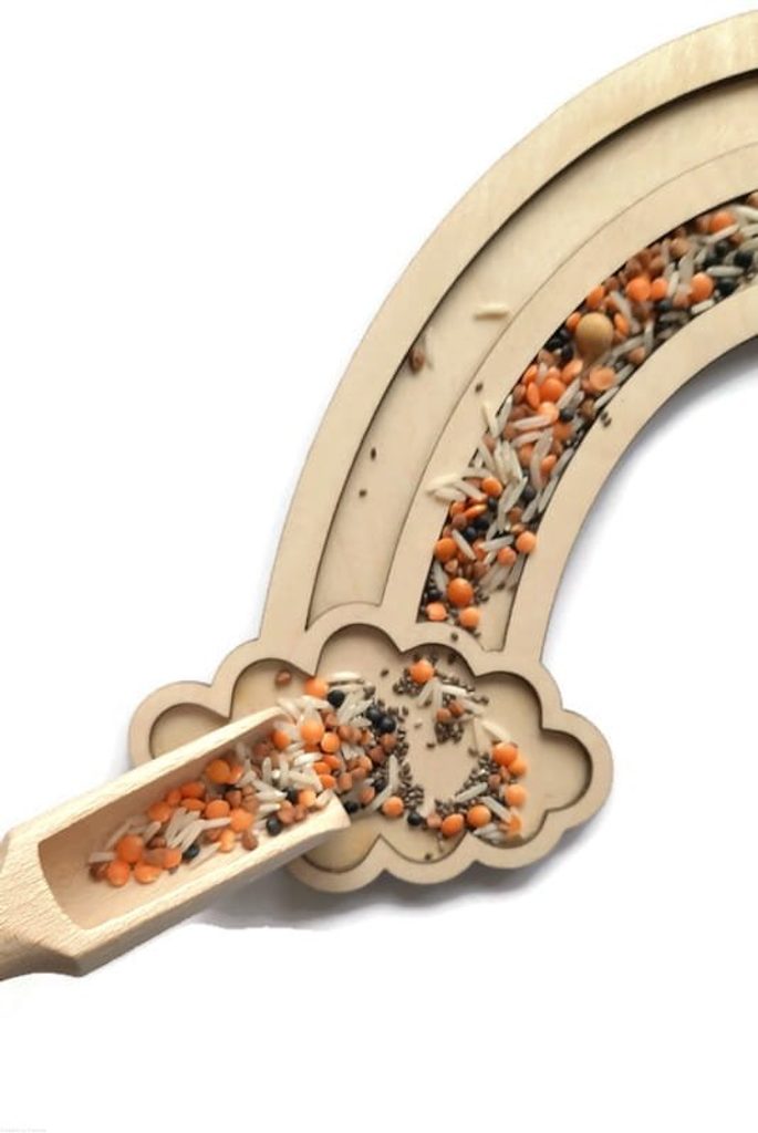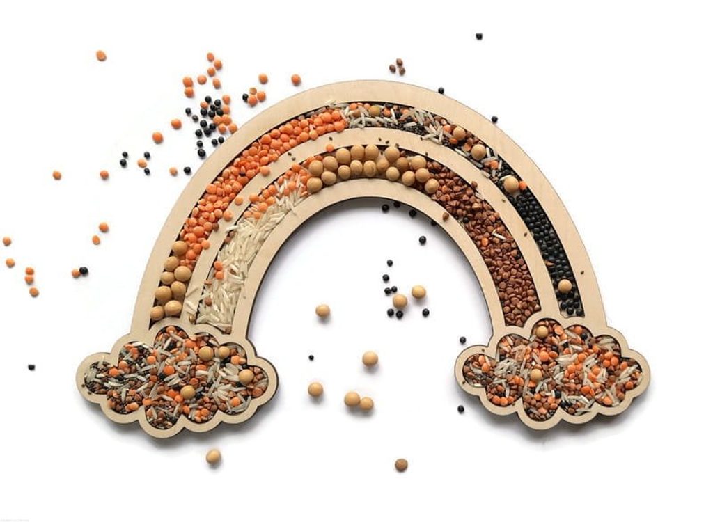 Doporučujeme smyslové hry s použitím přírodních produktů, jako je rýže, barevné kroupy, fazole, hrách, kávová zrna atd. 🌾 Další atraktivní materiály, které lze použít k vysypávání: kinetický písek, barevné korálky, bambulky atd.