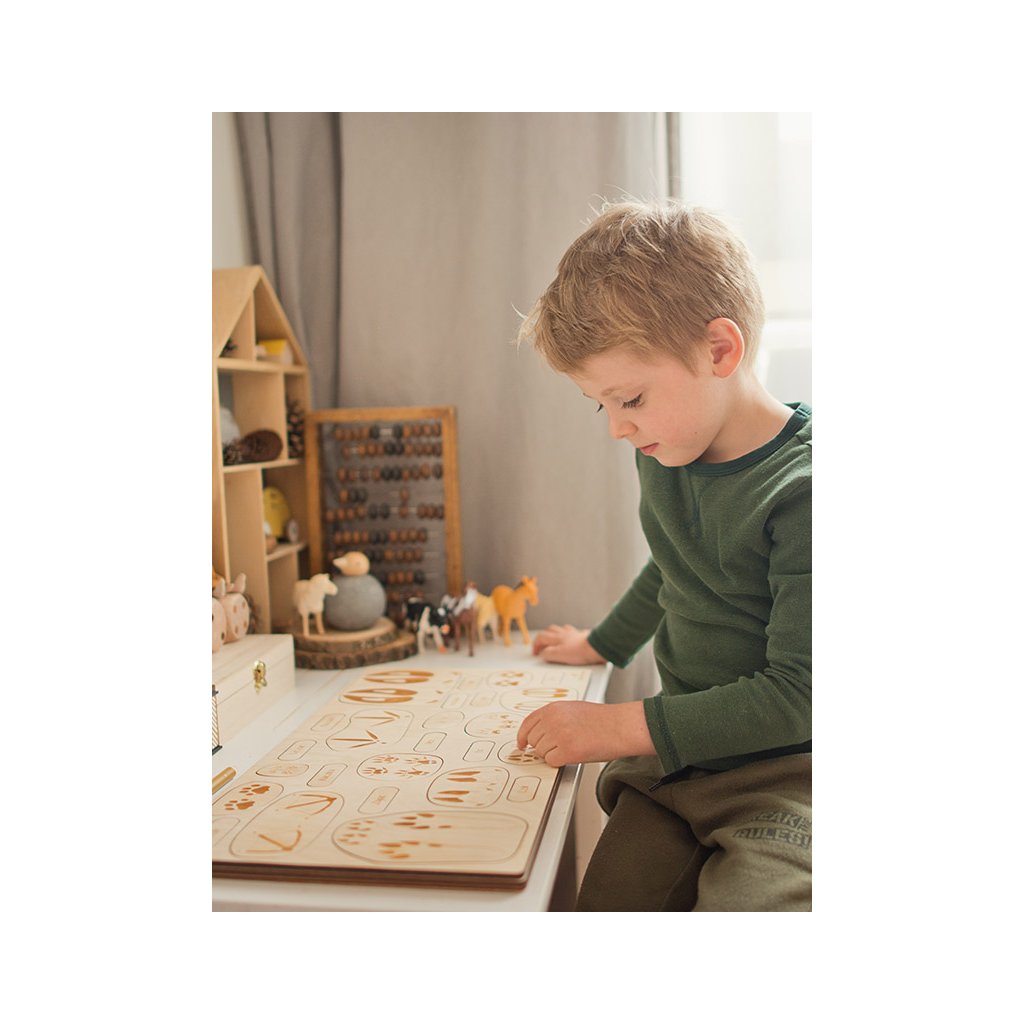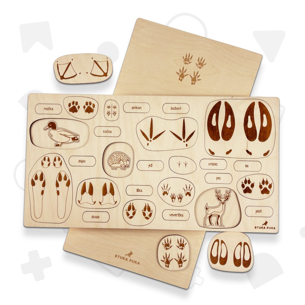 Chtěli byste zjistit, kdo se potuluje po vaší zahradě nebo čí stopy jste našli v lese? Dřevěné edukativní puzzle "Stopy zvířat" vás naučí, jak uhodnout, které zvíře vám zkřížilo cestu.