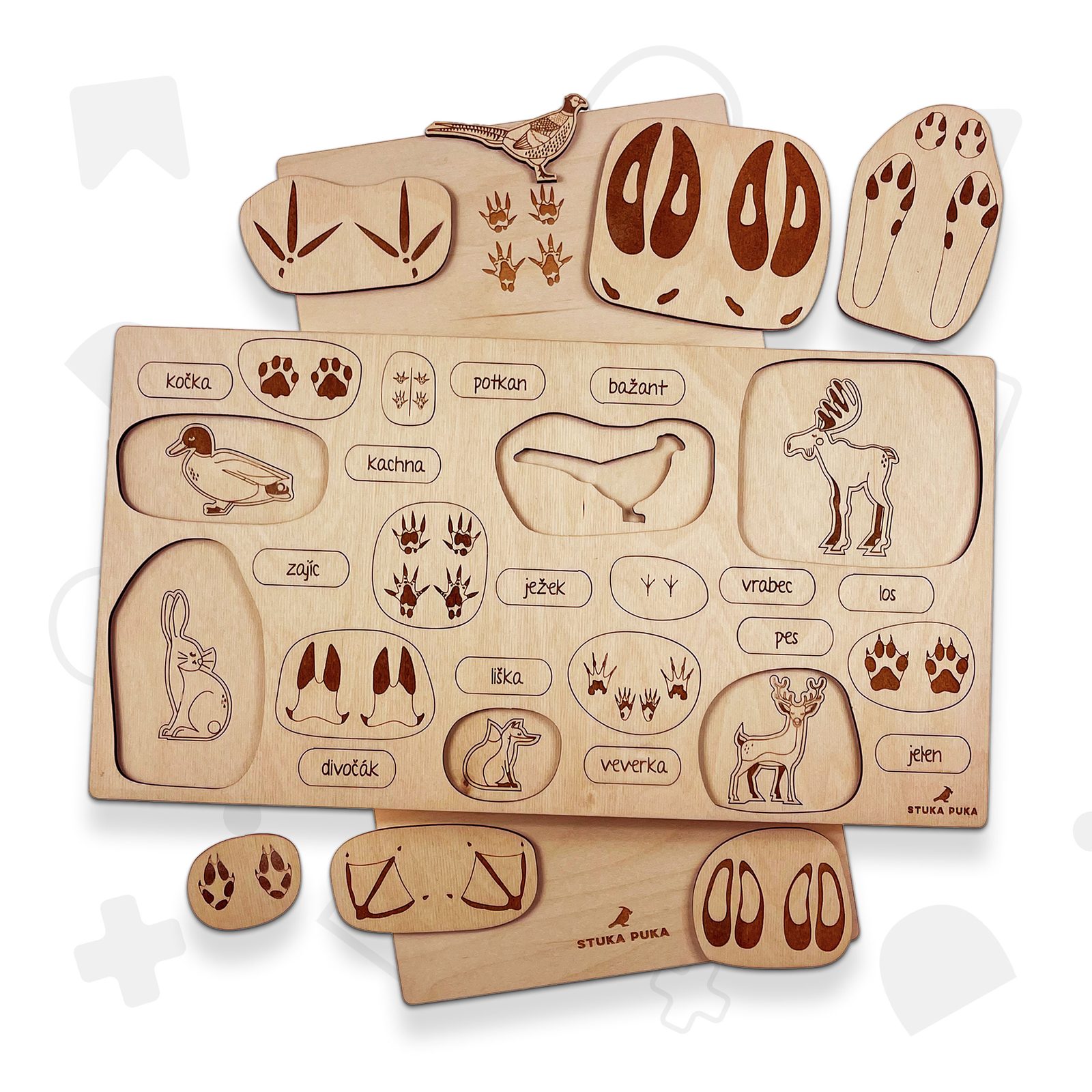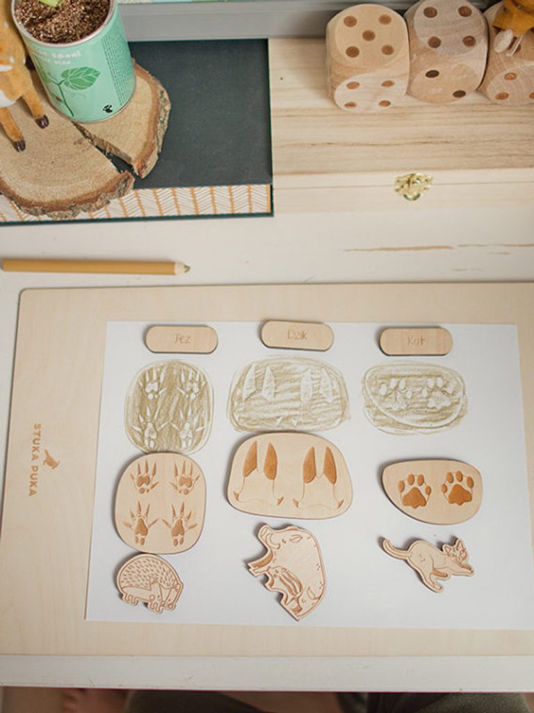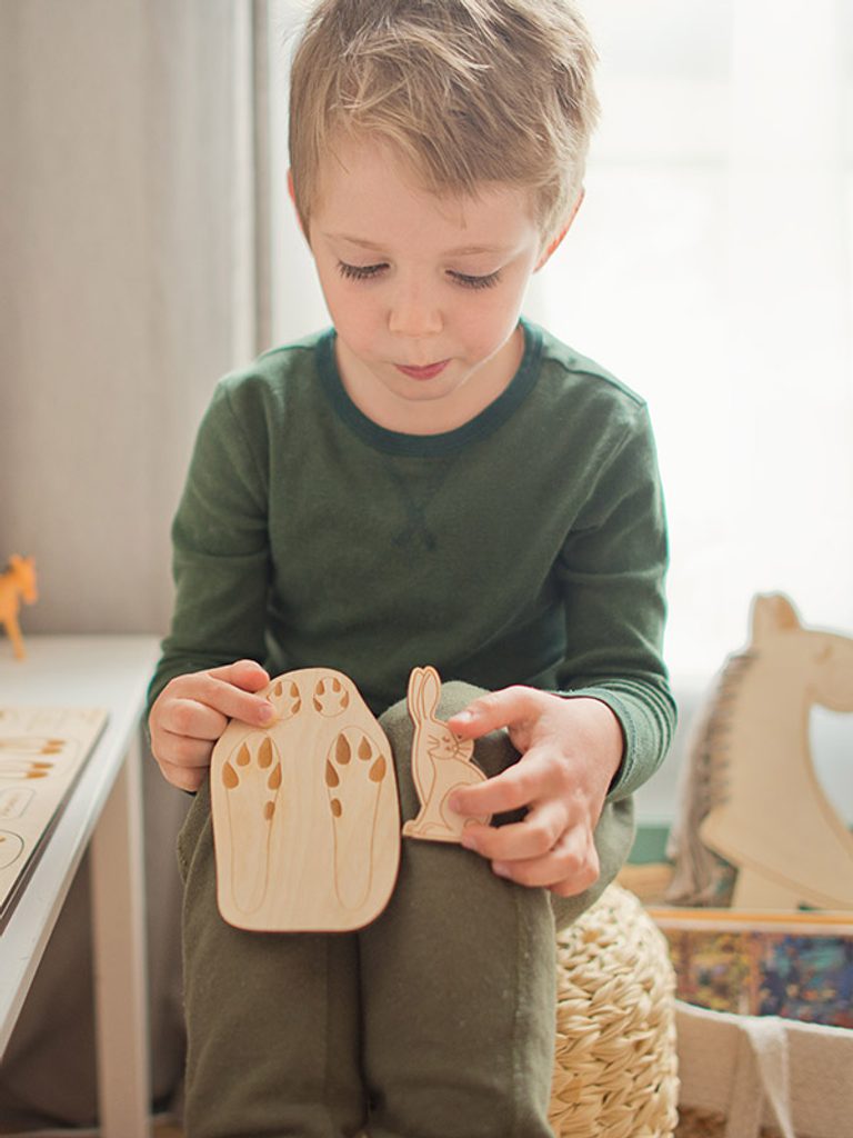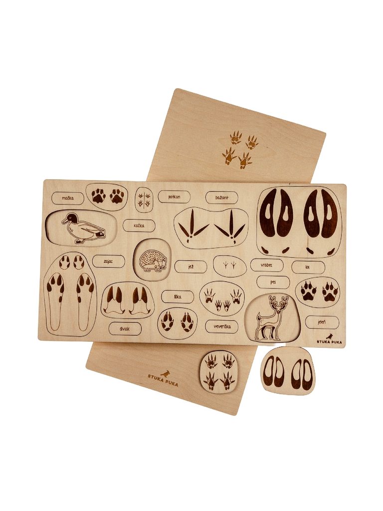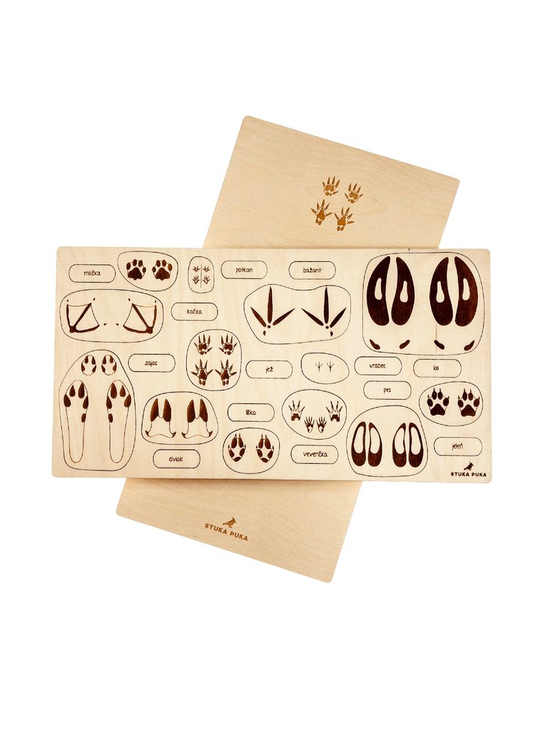 Chtěli byste zjistit, kdo se potuluje po vaší zahradě nebo čí stopy jste našli v lese? Dřevěné edukativní puzzle "Stopy zvířat" vás naučí, jak uhodnout, které zvíře vám zkřížilo cestu.