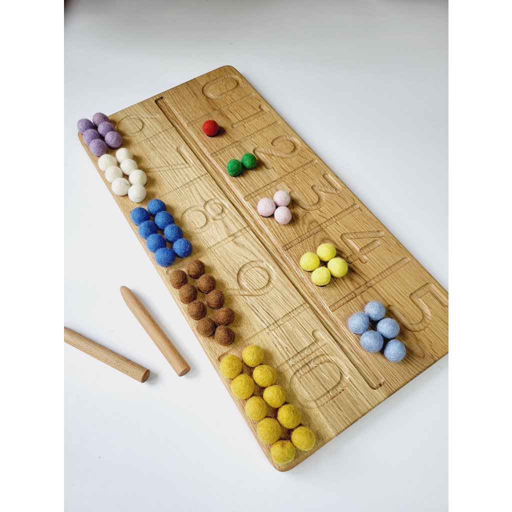 Obsahuje 2 tabulky a 55 plstěných kuliček v plátěném vaku. Vyrobeno z dubového dřeva a upraveno přírodním olejem.