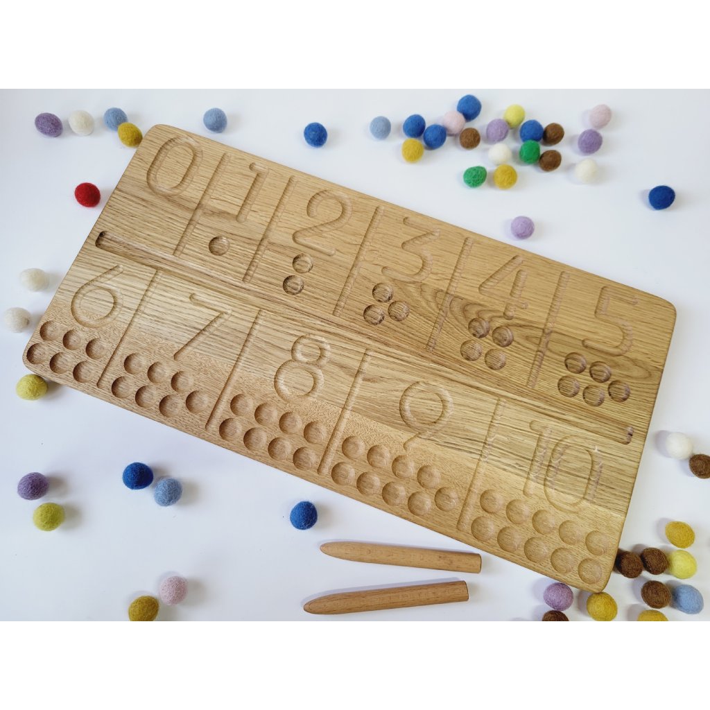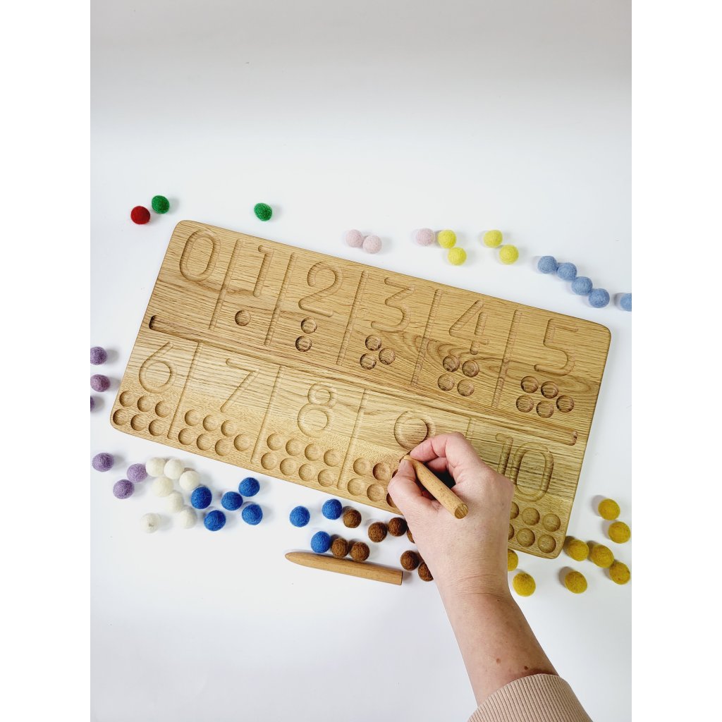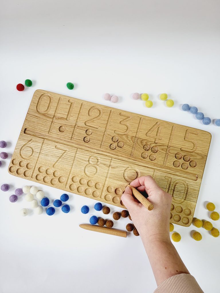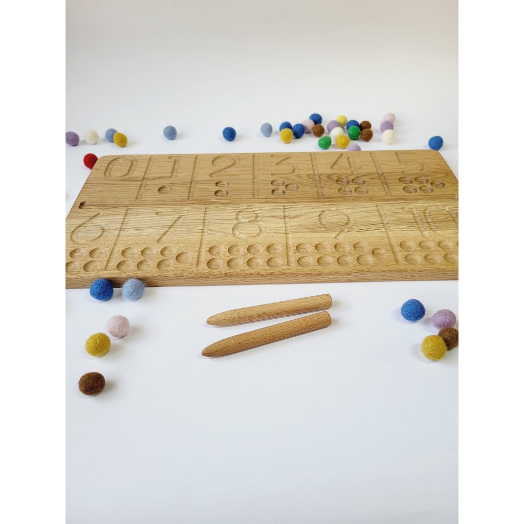 Dítě může zároveň dřevěnou pastelkou/stylusem opisovat vyřezaná čísla a zdokonalovat tak svou grafomotoriku.