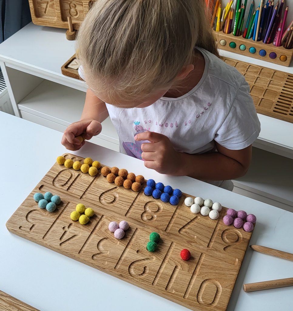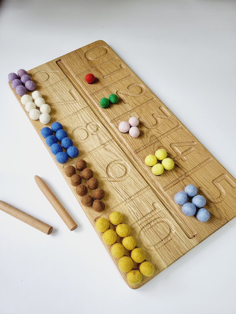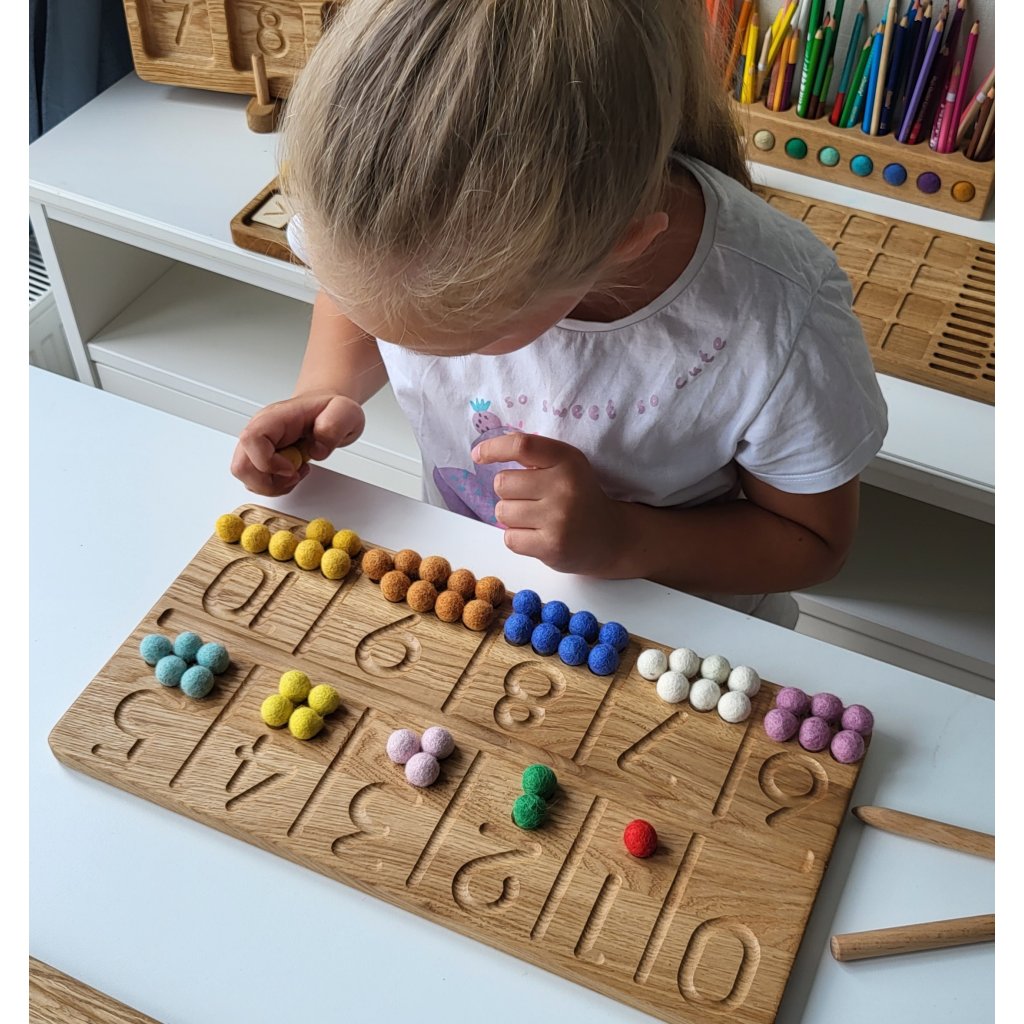 Z řady plné kuliček má dítě za úkol doplnit takový počet kuliček, jaký je uveden v každém okýnku počítací tabulky. Tímto způsobem se dítě naučí čísla a zároveň se naučí počítat.