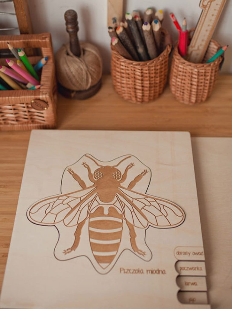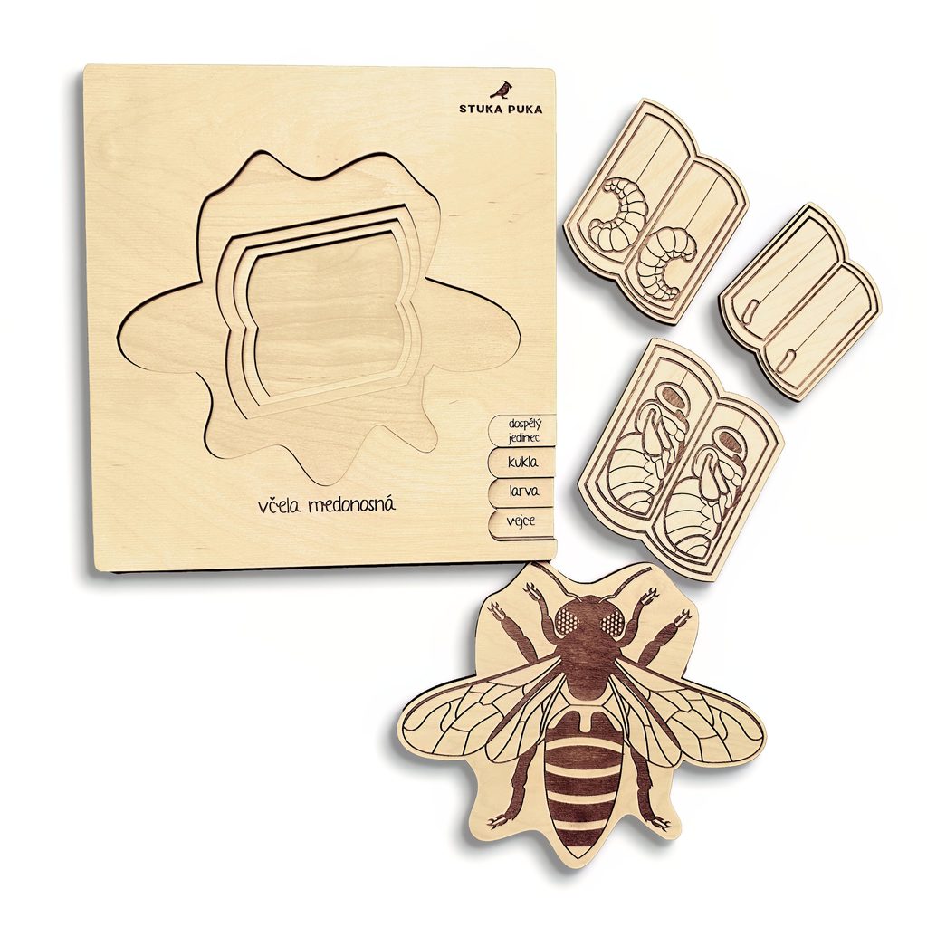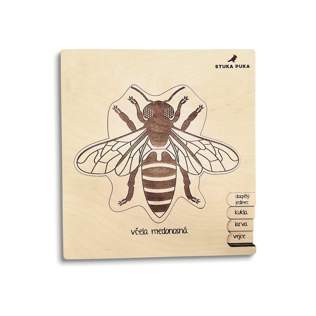 Tato dřevěná vkládačka vás provede jednotlivými vývojovými fázemi včely.